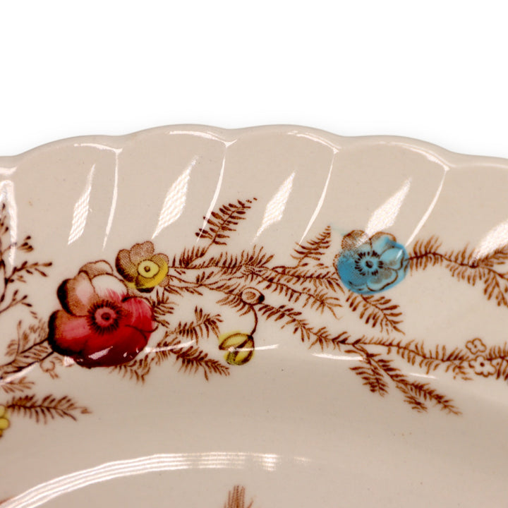 This Clarice Cliff platter, produced by Royal Staffordshire A.J. Wilkinson Ltd., England, is a fine example of 1930s English semi-porcelain dinnerware. The platter features the elegant Royal Harvest pattern, with richly colored floral sprays in brown, yellow, pink, and blue, set against a creamy background. The scalloped and fluted edge enhances its classic design, making it both functional and collectible.