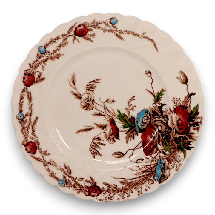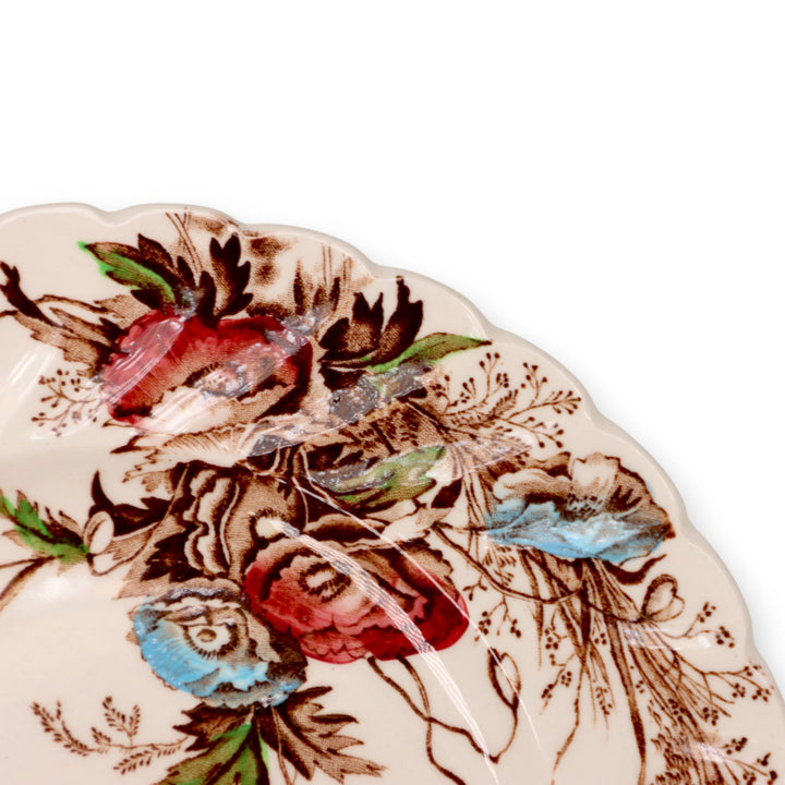 This Clarice Cliff bread plate, produced by Royal Staffordshire A.J. Wilkinson Ltd., England, is a fine example of 1930s English semi-porcelain dinnerware. The plate features the elegant Royal Harvest pattern, with richly colored floral sprays in brown, yellow, pink, and blue, set against a creamy background. The scalloped and fluted edge enhances its classic design, making it both functional and collectible.