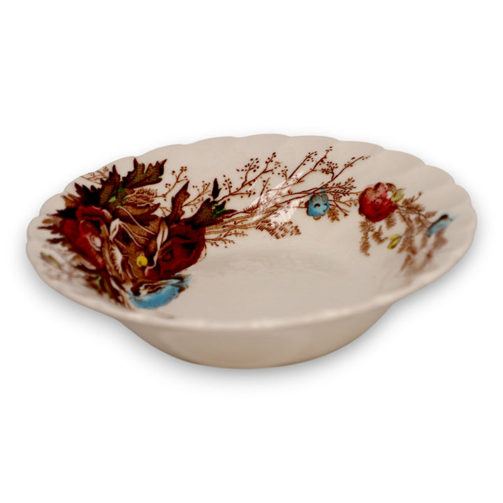 This beautiful Clarice Cliff fruit/berry bowl, made by Royal Staffordshire, A.J. Wilkinson Ltd., England, features a warm cream semi-porcelain base with a detailed transfer floral design in brown, pink, and blue accents. The scalloped edge and rich, earthy Art Deco-inspired design reflect Clarice Cliff’s early work in the 1930s. A fine collectible for lovers of English dinnerware or Art Deco ceramics.