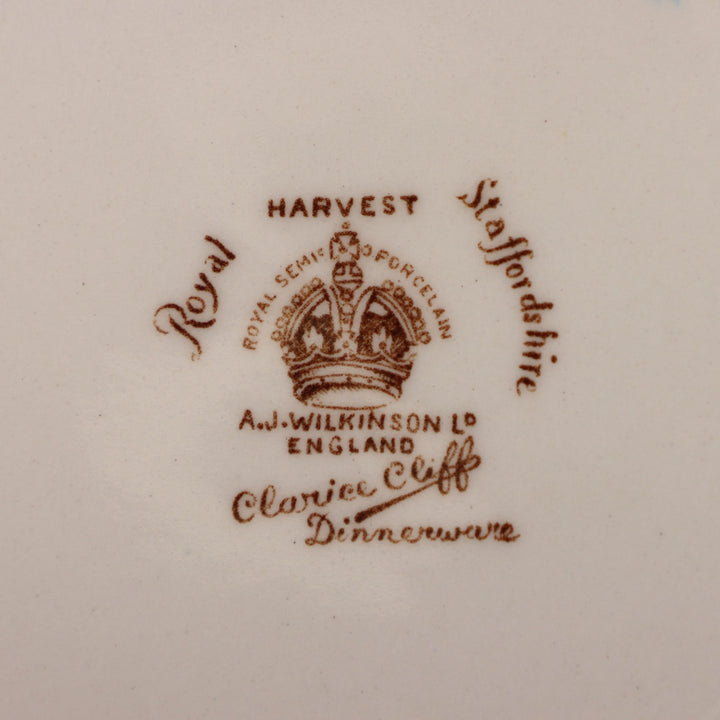 Backstamp: Brown crown mark, “Royal Staffordshire, Clarice Cliff, A.J Wilkinson, Dinnerware”