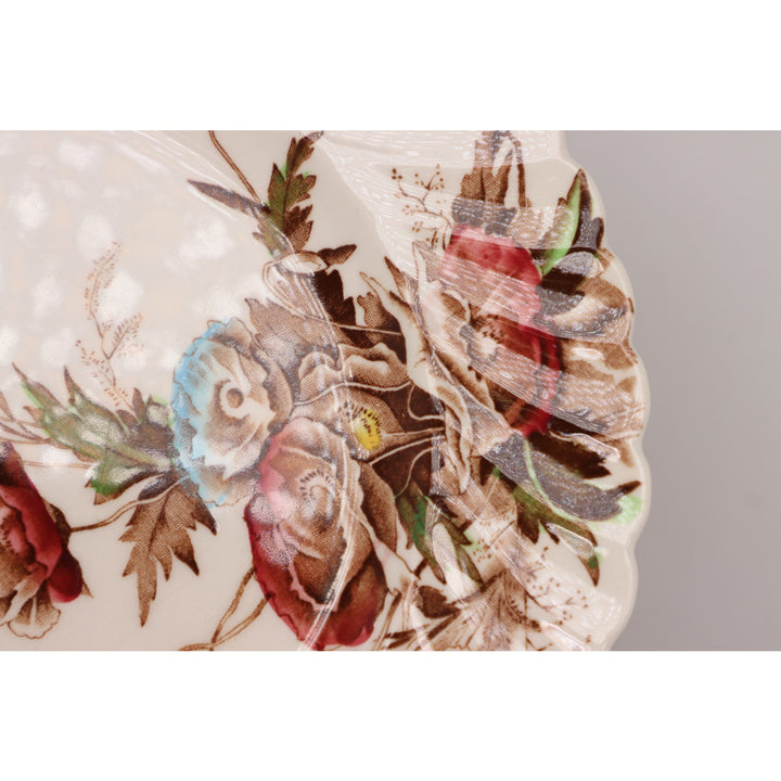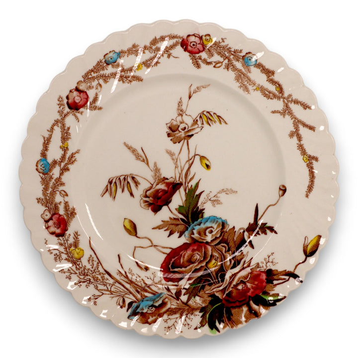 This Clarice Cliff salad plate, produced by Royal Staffordshire A.J. Wilkinson Ltd., England, is a fine example of 1930s English semi-porcelain dinnerware. The plate features the elegant Royal Harvest pattern, with richly colored floral sprays in brown, yellow, pink, and blue, set against a creamy background. The scalloped and fluted edge enhances its classic design, making it both functional and collectible.