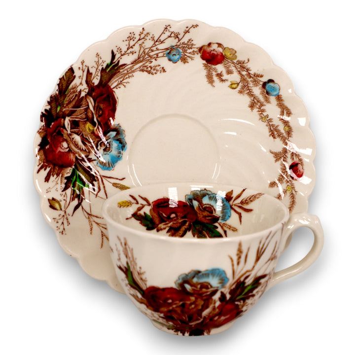 This Clarice Cliff tea cup and saucer, produced by Royal Staffordshire A.J. Wilkinson Ltd., England, is a fine example of 1930s English semi-porcelain dinnerware. The tea cup features the elegant Royal Harvest pattern, with richly colored floral sprays in brown, yellow, pink, and blue, set against a creamy background. The scalloped and fluted edge enhances its classic design, making it both functional and collectible.