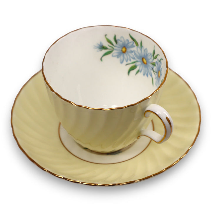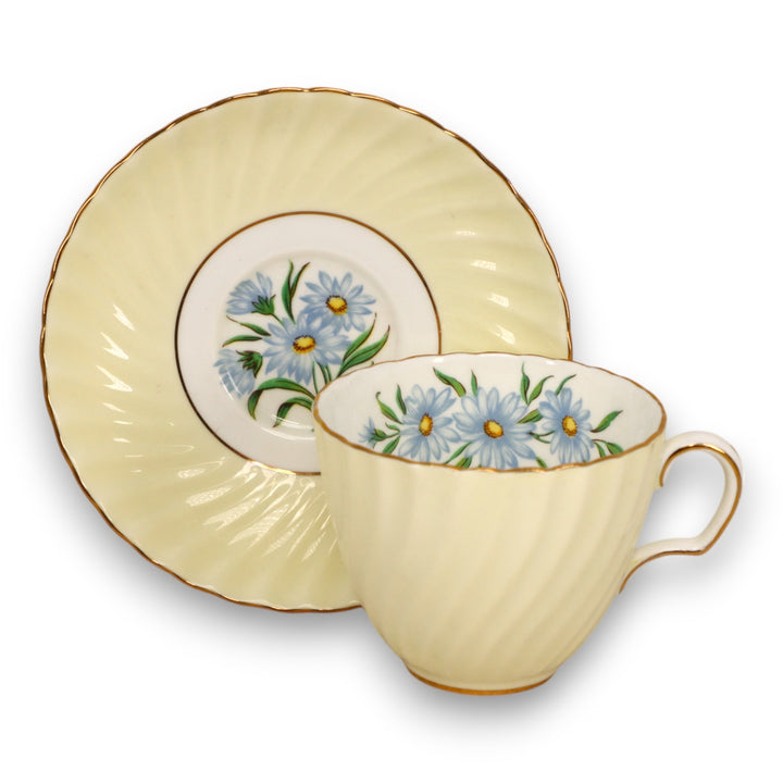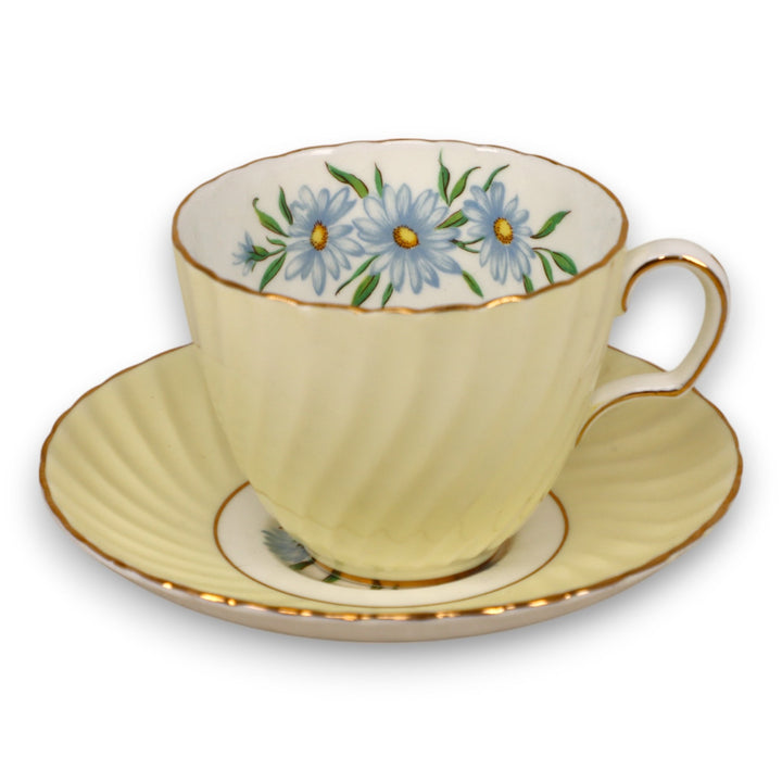 This charming vintage tea cup and saucer set was made by Adderley, a renowned English maker of fine bone china. The interior of the cup and the center of the saucer are beautifully adorned with light blue daisy flowers, bordered with gold trim. The softly ribbed, pale yellow exterior and fluted design make it a quintessential example of mid-20th century English tea ware elegance.