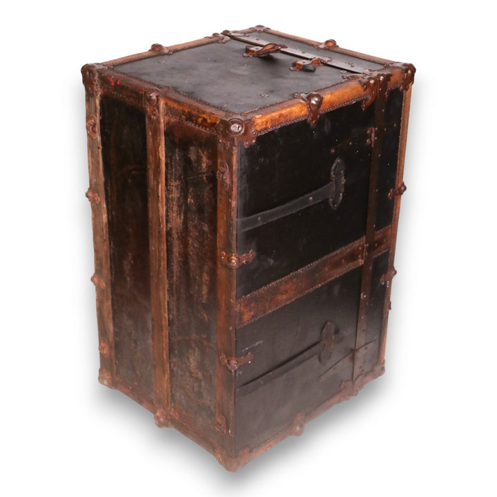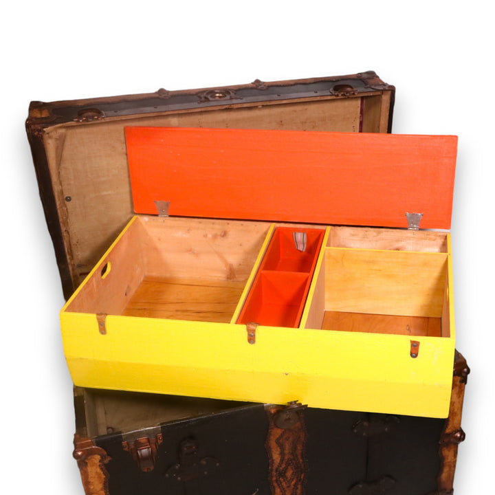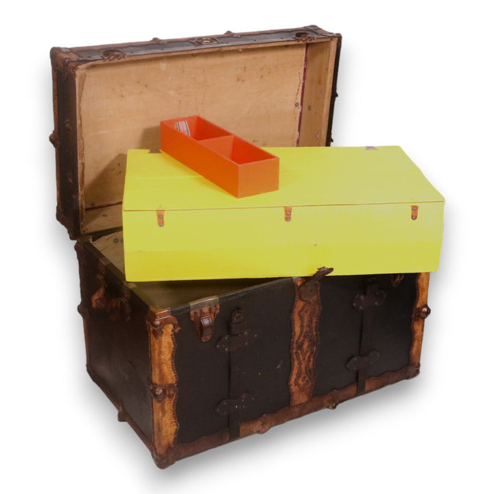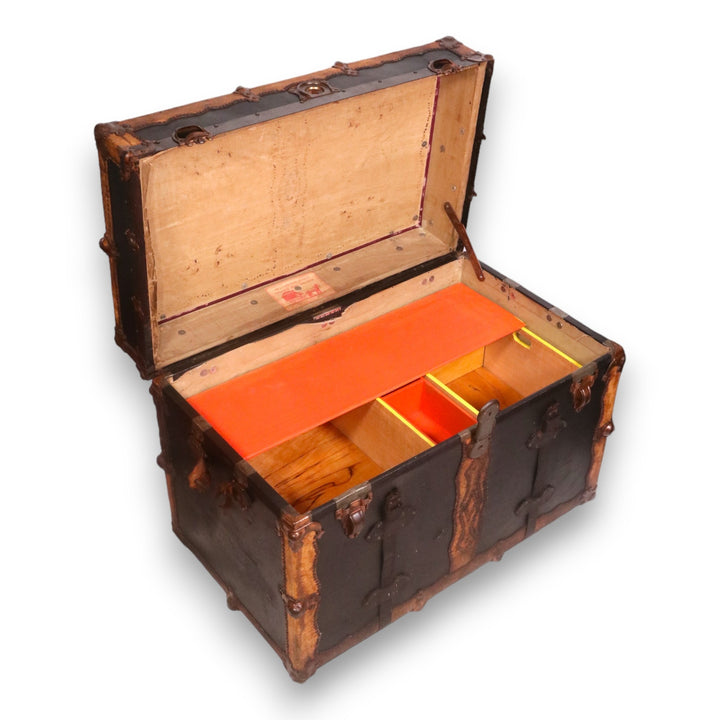 Once white leather trim is now patinaed with many studded rivet heads over black leather panels. Edge and corner guards retain some of their original copper finish. Brass LE Meeks badge on front of lid. Decal on inside. Tray is in excellent condition and has been repainted in bright yellow and orange. Bottom is in very good condition with original rollers. No key. Leather handle on one side is partially remaining. No odors. Is solid in build.