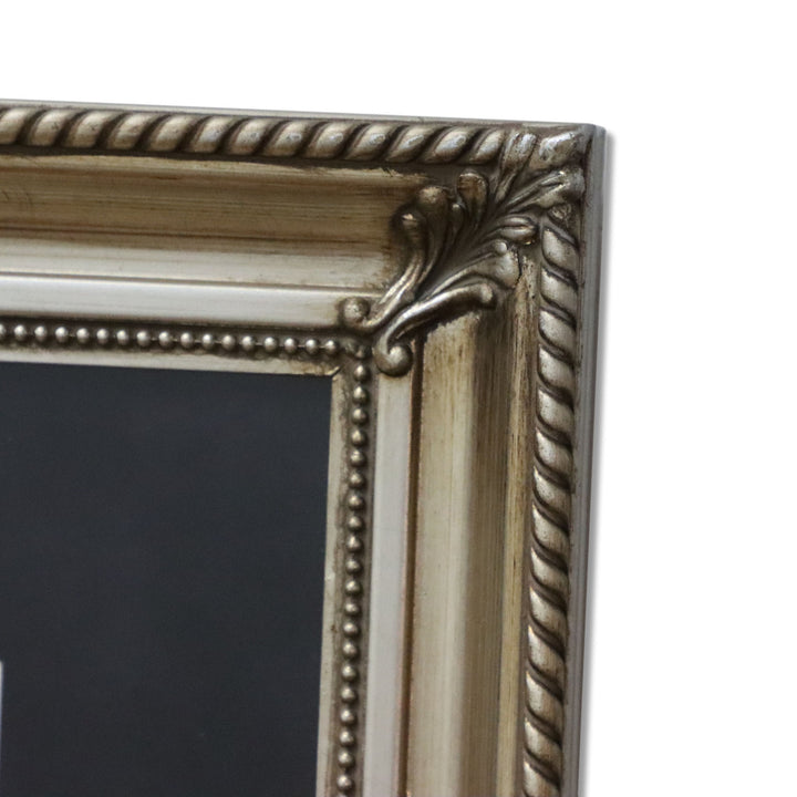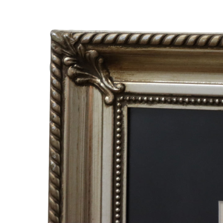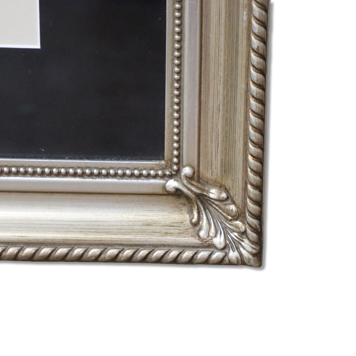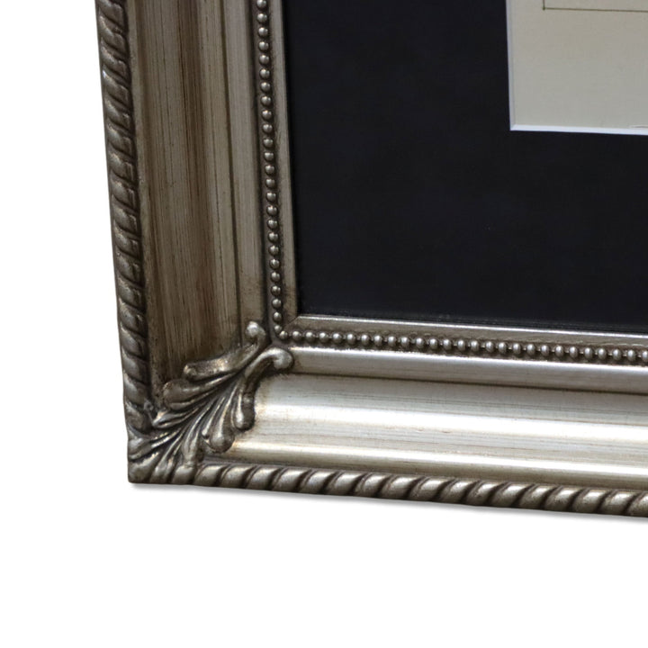 Matted in antiqued silver finish wood frame with hanging hardware.