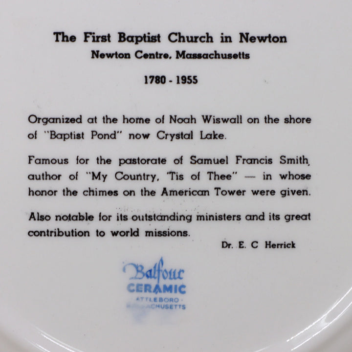 Balfour Ceramic 175th Anniversary First Baptist Church of Boston Newton Plate 1955