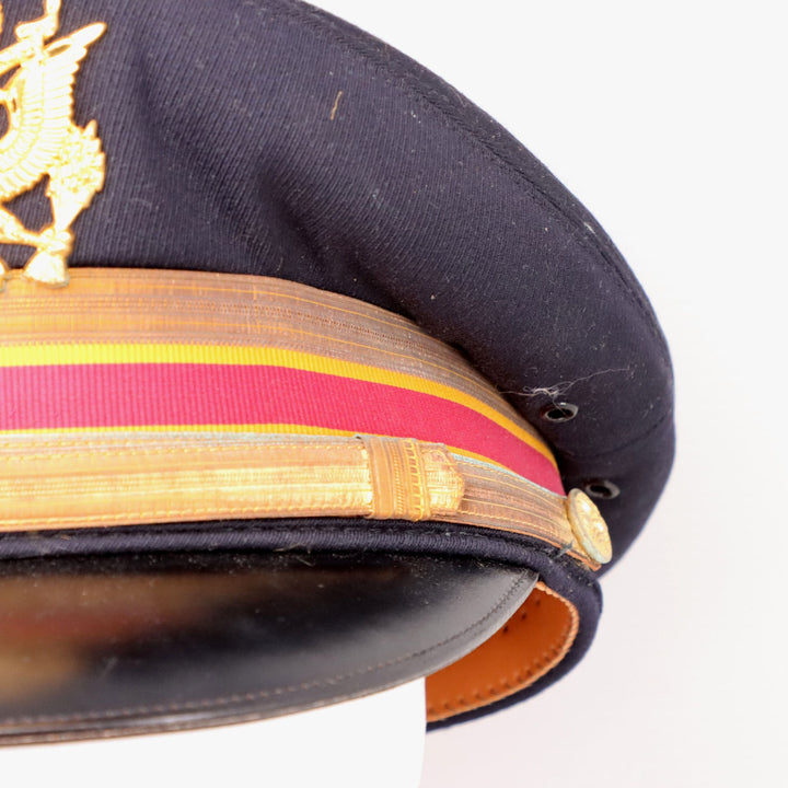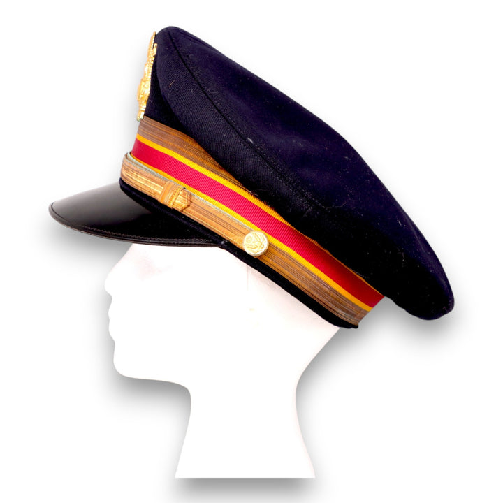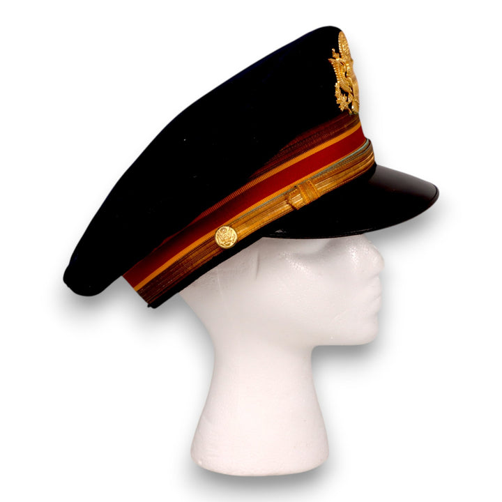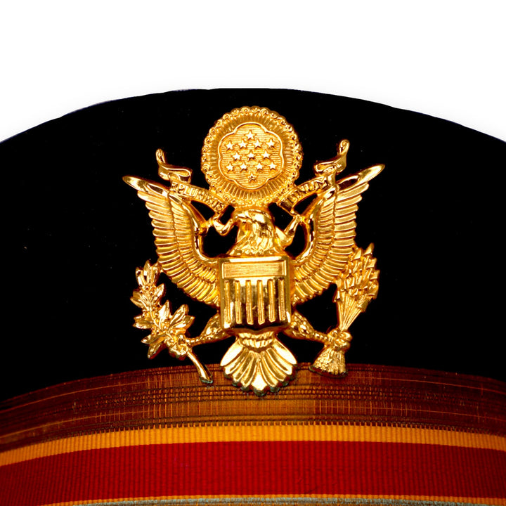 This vintage US Army Officer's dress visor cap is crafted by Berkshire De Luxe, known for its distinctive style and quality construction. Featuring a black wool crown with gold bullion banding, red and gold hatband stripes, and the iconic US Great Seal eagle insignia in gold, this hat is a timeless military collectible.