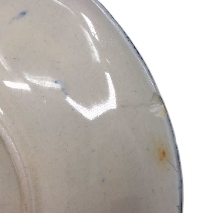Good condition. Light crazing on back with bits of blue spots and one rim chip on underside of a rim.