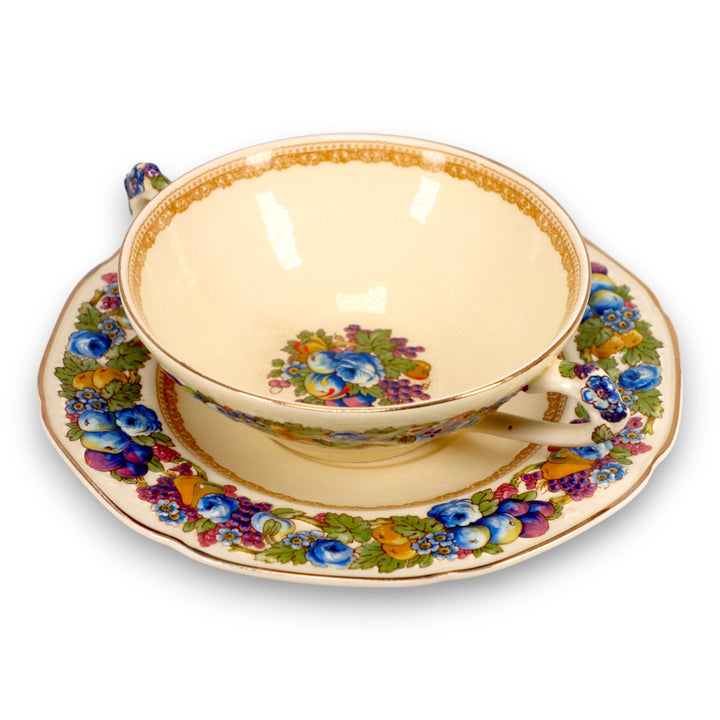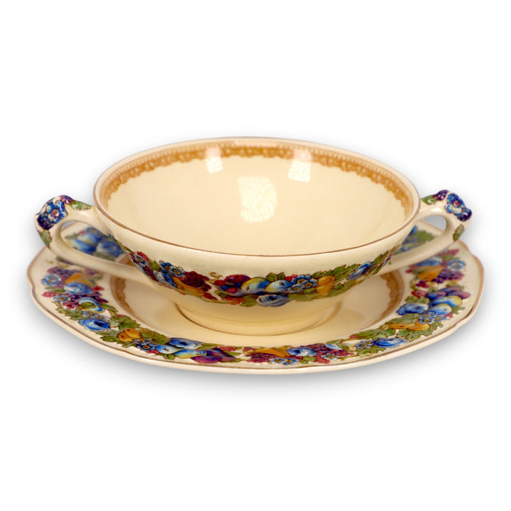 This vibrant Crown Ducal “Florentine” bouillon cup and saucer set captures the charm and color of 1930s English pottery. The cream-toned body is adorned with a lush floral and fruit garland in rich jewel tones of cobalt, amethyst, and gold, framed with a scalloped edge. Each handled cup features intricate detailing and classic Art Deco influences — an exquisite display piece or addition to a vintage English china collection.