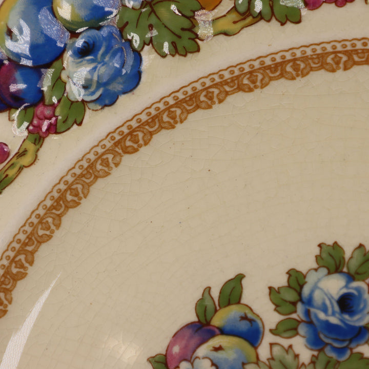This beautiful dinner plate by Crown Ducal features the vibrant Florentine pattern, showcasing a lush central bouquet and colorful fruit garland border with hand-painted detailing. Produced in England circa 1930s, this antique earthenware piece reflects the charm of English Art Deco craftsmanship. Its multicolored design and scalloped edge with gold trim make it an elegant addition to any antique dinnerware collection or decorative display.