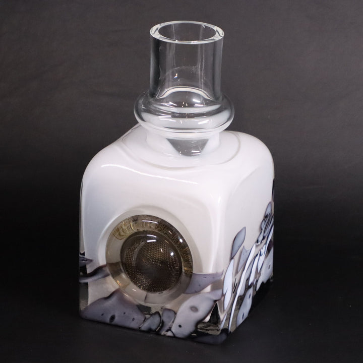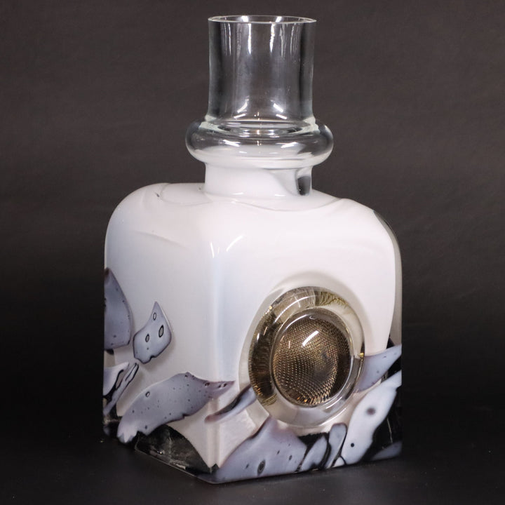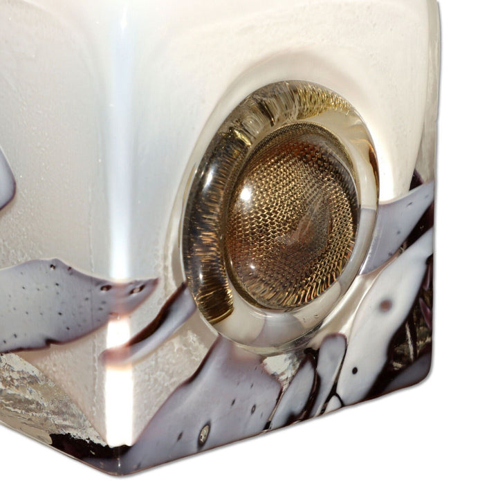 There is a silver mesh screen behind the circular front but the interior of this "bottle" is all glass so the screen is encased.The interior is hollow like a vase or a bottle. This sculpture is clear but encased in a white milky color and colors of gray have been applied all around.