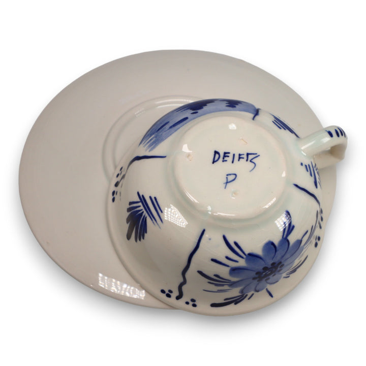 This is a charming hand-painted Delft tea cup and saucer set, showcasing the timeless Dutch blue-and-white style that has been cherished for centuries. Made in Delft, Holland, this piece features a scenic design in cobalt blue with house and floral accents, all delicately painted by hand. The traditional mark "Delfts" is visible on the underside. A wonderful collectible for lovers of Dutch pottery, blue-and-white porcelain, or European folk art design.