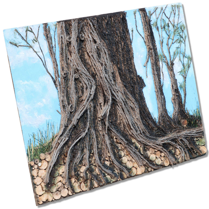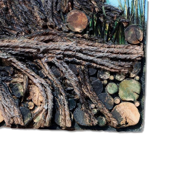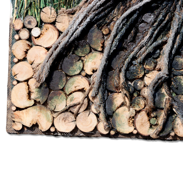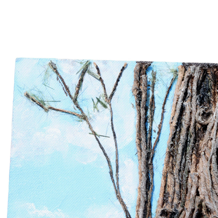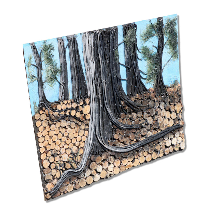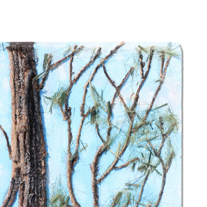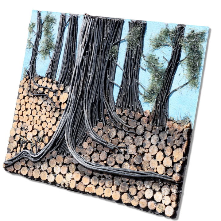 Tall single pine tree made of layered acrylic painted layered jute twine with furry green pine needles in front of a blue sky. Ground is composed of many disks of branch cut offs. Unframed on hardboard.