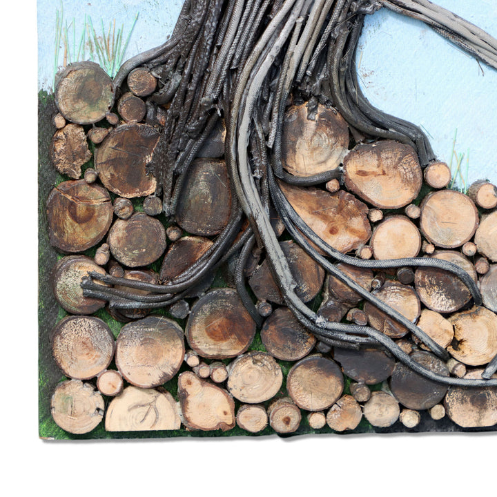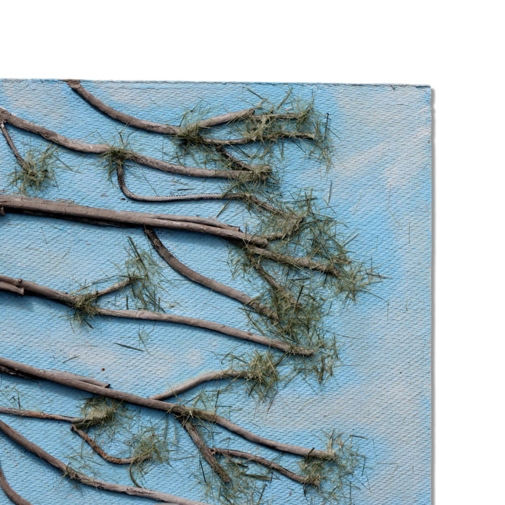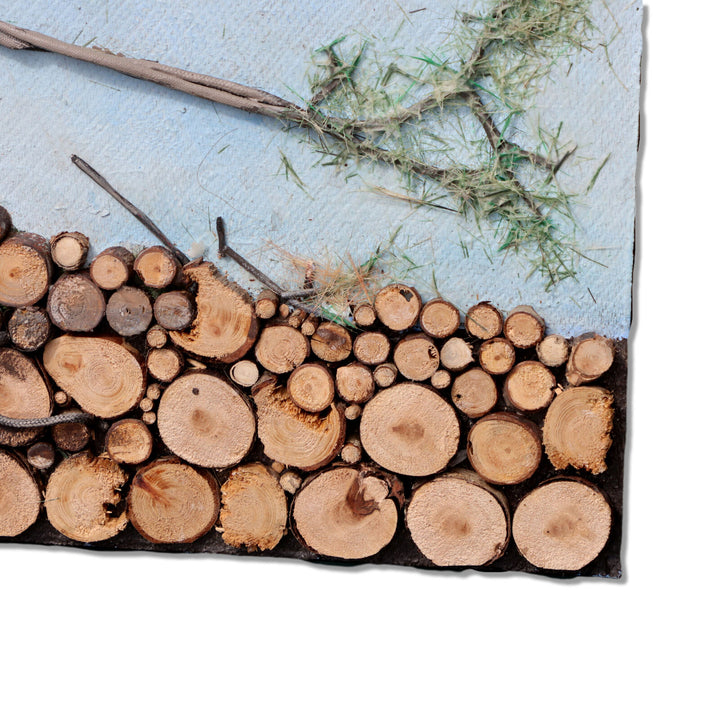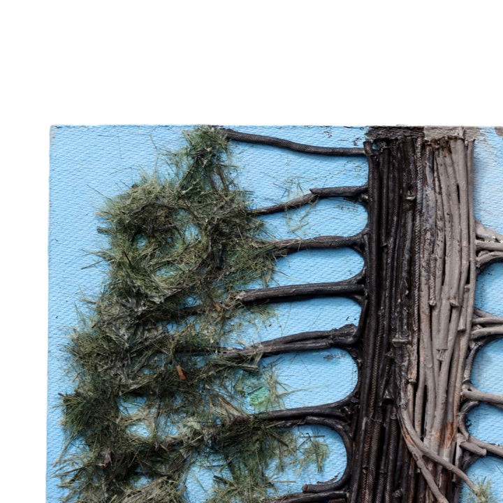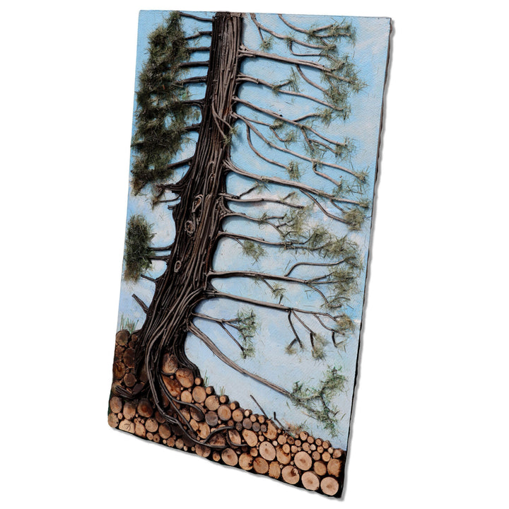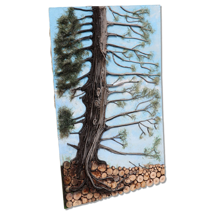 Tall single pine tree made of layered acrylic painted layered linen cord with furry green pine needles in front of a blue sky. Ground is composed of many disks of branch cut offs. Unframed on hardboard with paper backing.