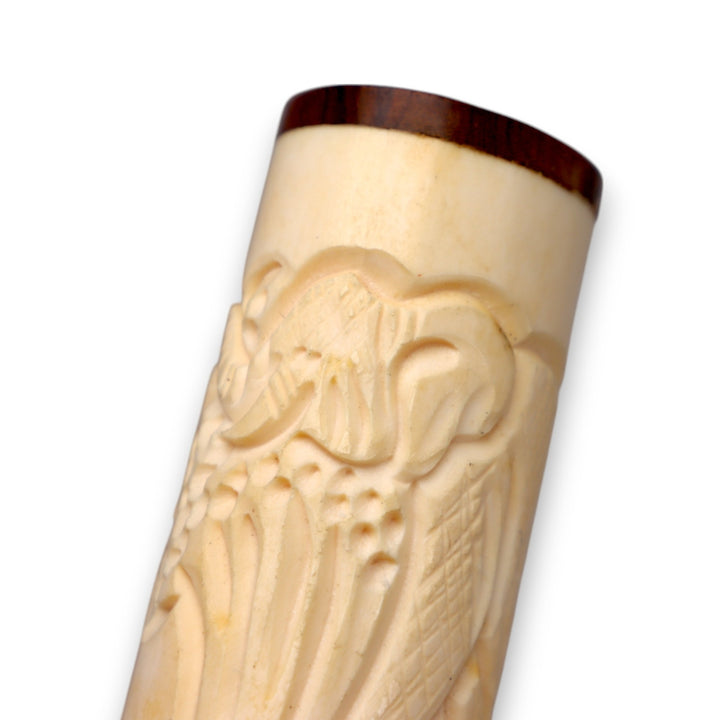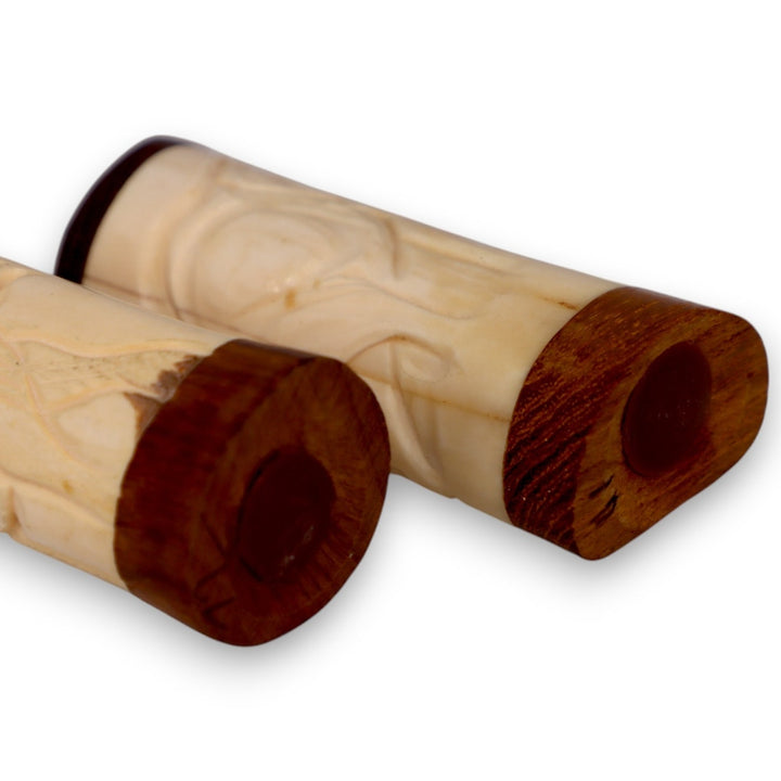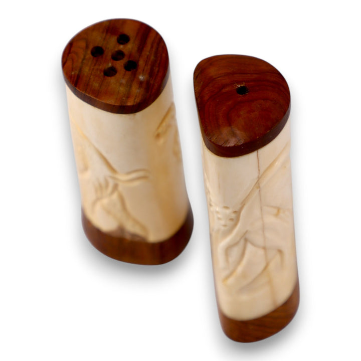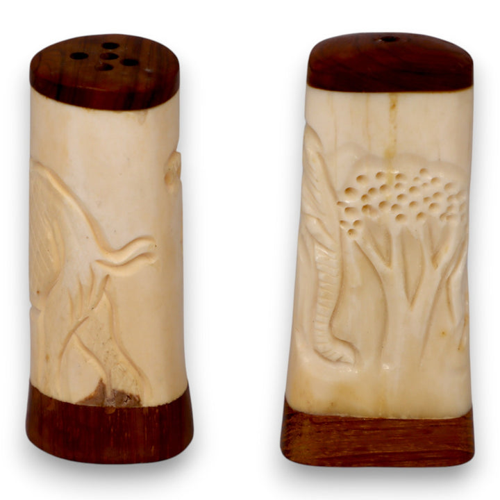 Elephant Carved Bone Salt & Pepper Shakers 3 1/4" Teak Wood Top Bottom Vintage