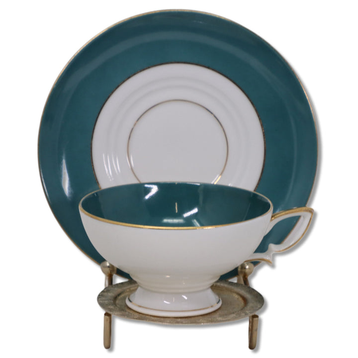 Eschenbach Bavarian A907 Footed Tea Cup Saucer Teal Green Gold Rim Vintage 1940