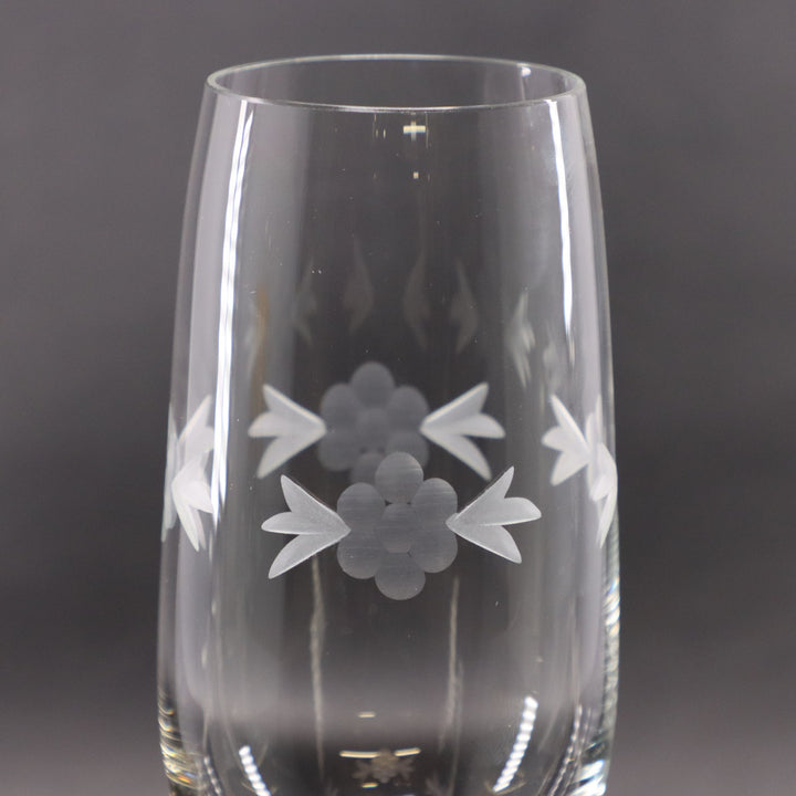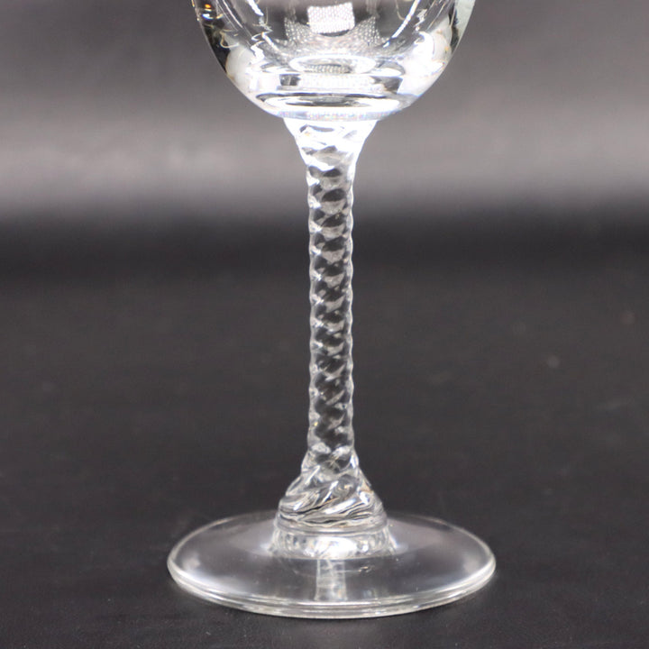 This elegant vintage crystal champagne flute features an etched floral motif and a stunning twisted stem, blending refined craftsmanship with mid-20th-century artistry. Its tall, slender bowl enhances the effervescence of sparkling wines, making it an ideal choice for celebratory occasions or a sophisticated barware collection. The hand-etched floral design gives each piece a touch of charm and individuality.