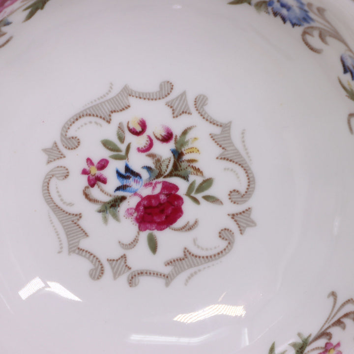 Blue & pink floral with green & brown leaves. Platinum scalloped trim