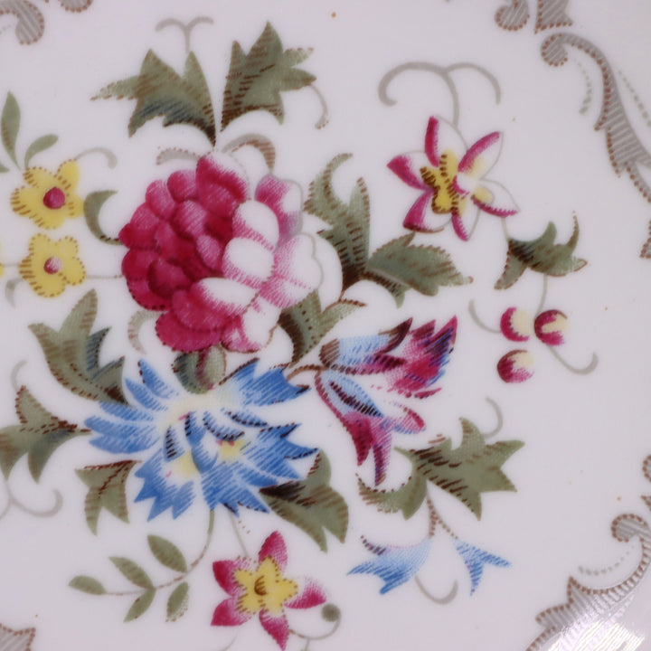 Blue & pink floral with green & brown leaves. Platinum scalloped trim