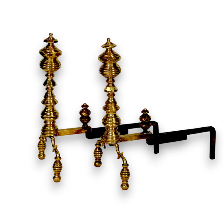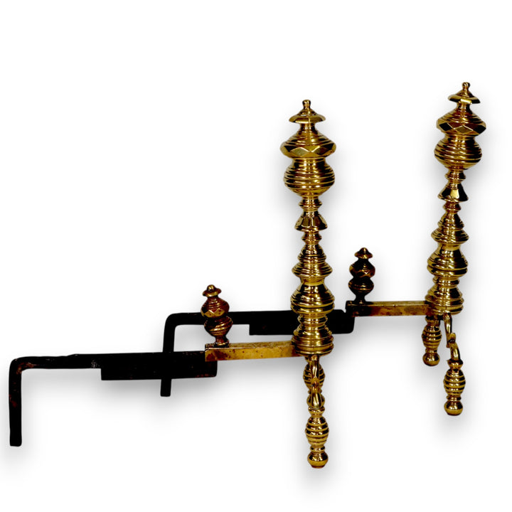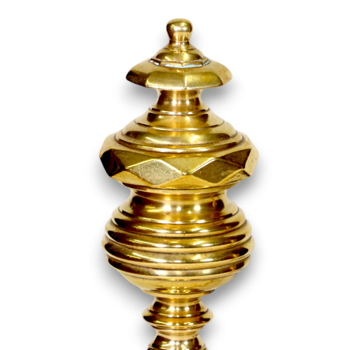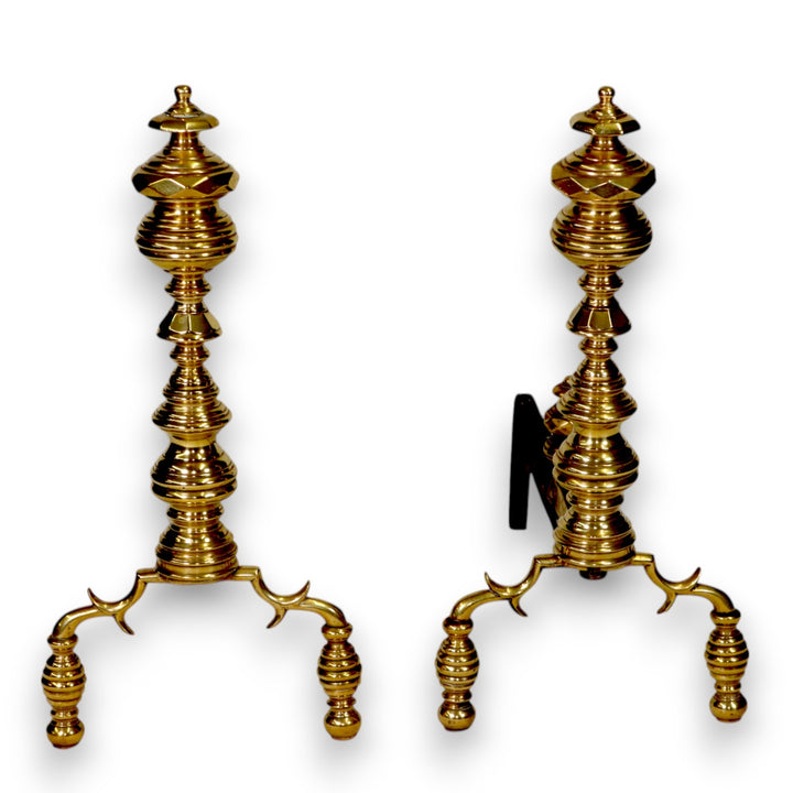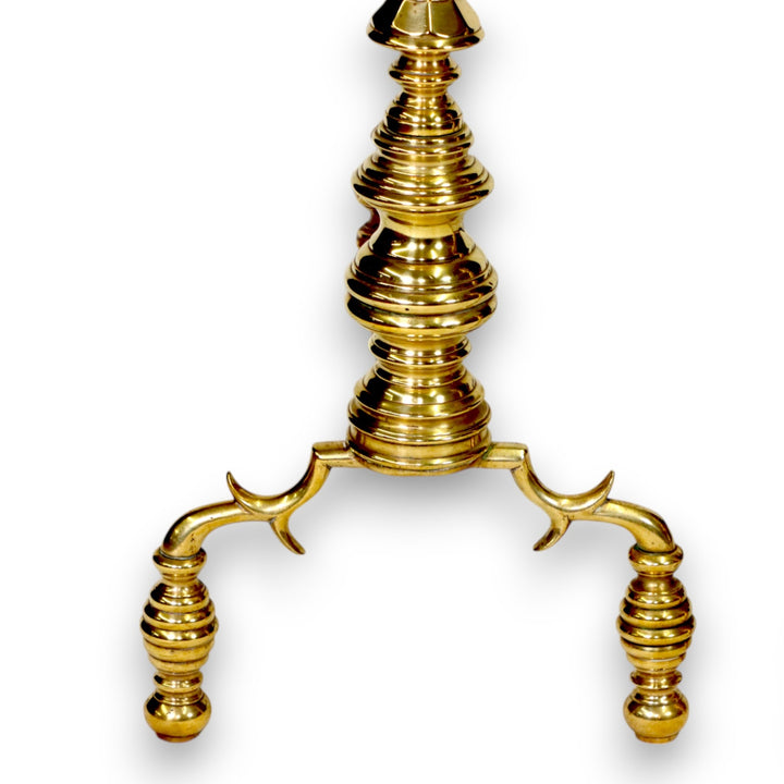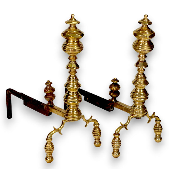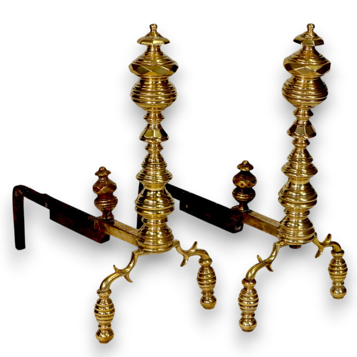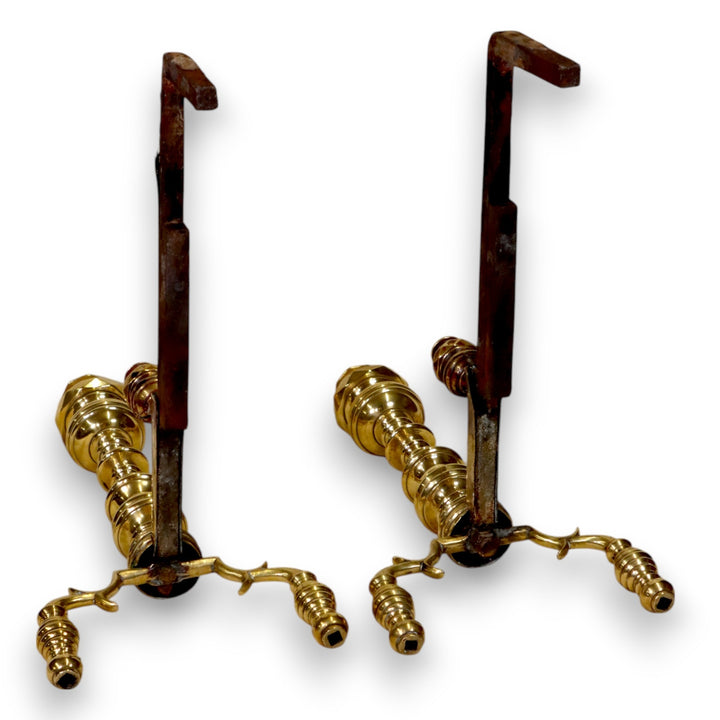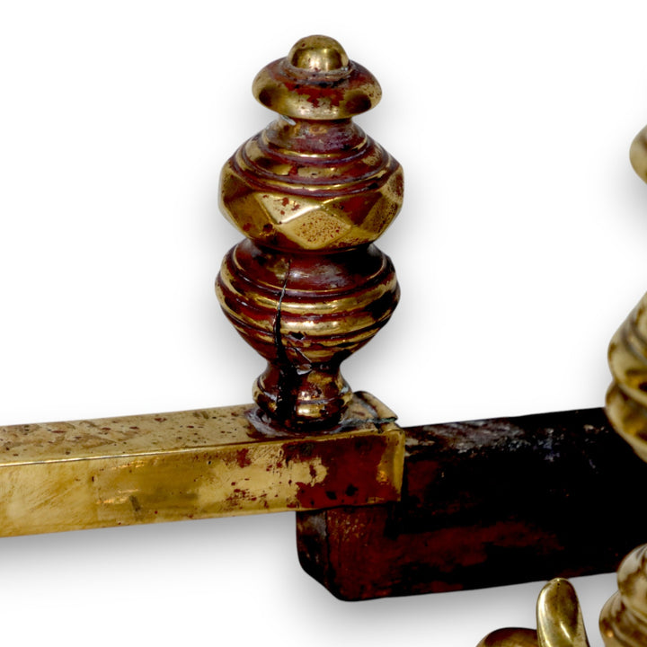 Georgian Brass 20 1/2" H x 20" D Andirons Log Stops Antique 19th C