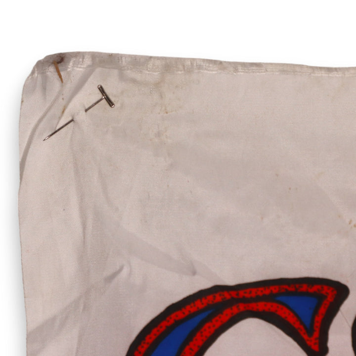 Good condition. Some edge fray. Sticker adhesive lower left corner. Spot of stuff on left red section of skull. See pics.