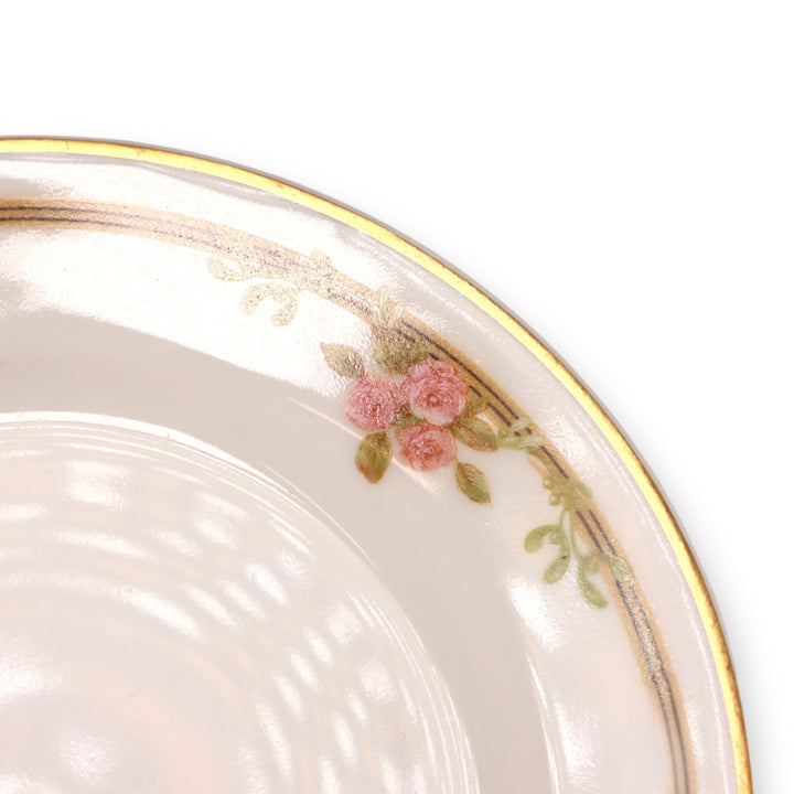 The design features a bright white background with gold trim. There is a pink rose and green leaf design on a yellowish tan and black band.