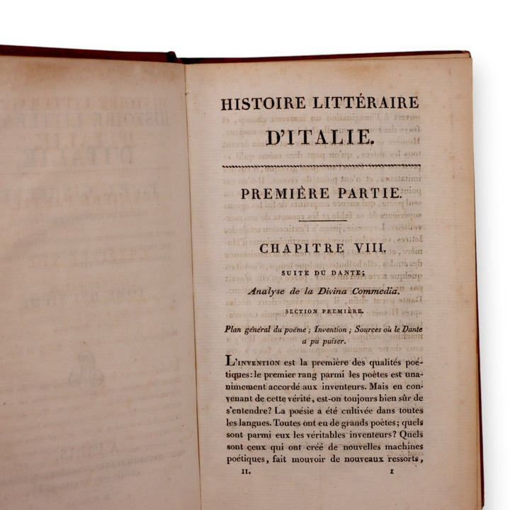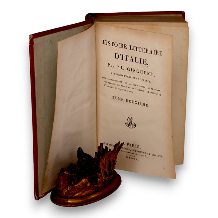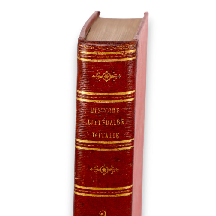 This is a reprint of Volume 2 of Histoire Littéraire d’Italie by P.L. Ginguené, printed in Paris in 1819 by L.G. Michaud, with printing done by L’Imprimerie d’Anth. Boucher. Bound in striking red leather with gilt detailing on the spine, this early 19th-century French book reflects Enlightenment-era scholarship on Italian literary history.
