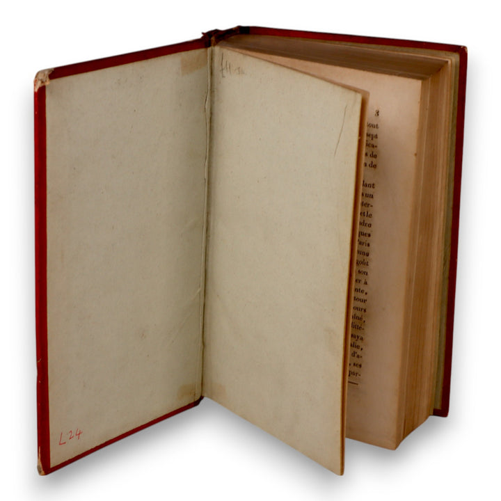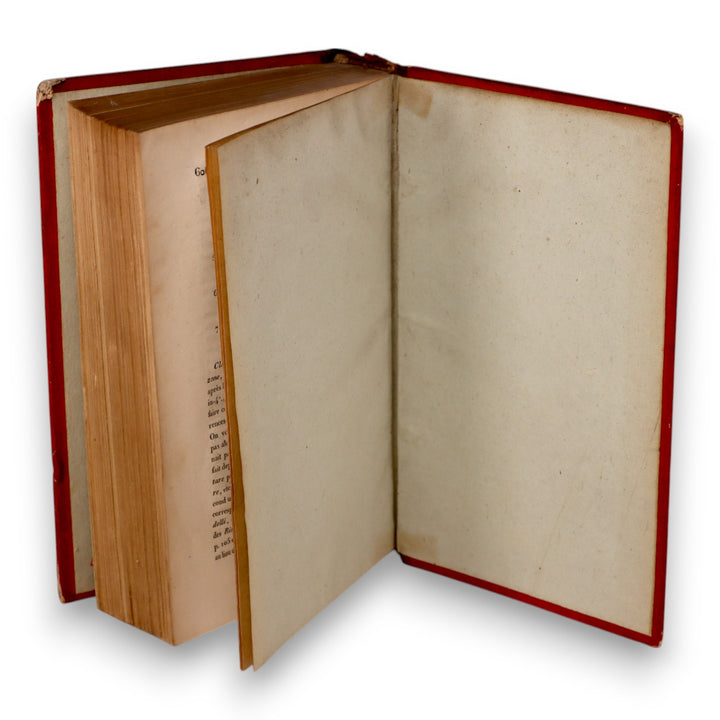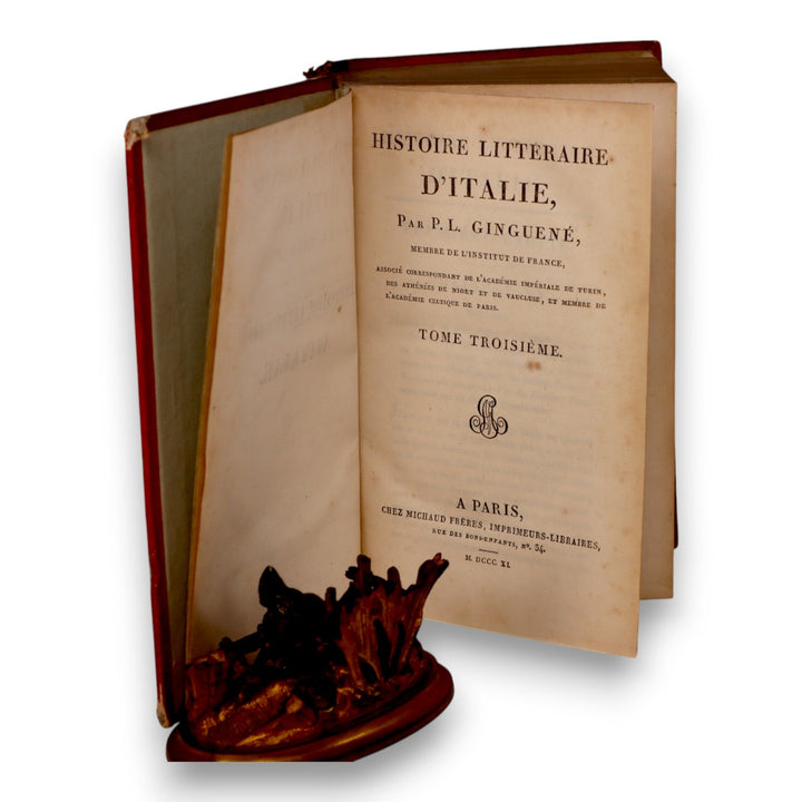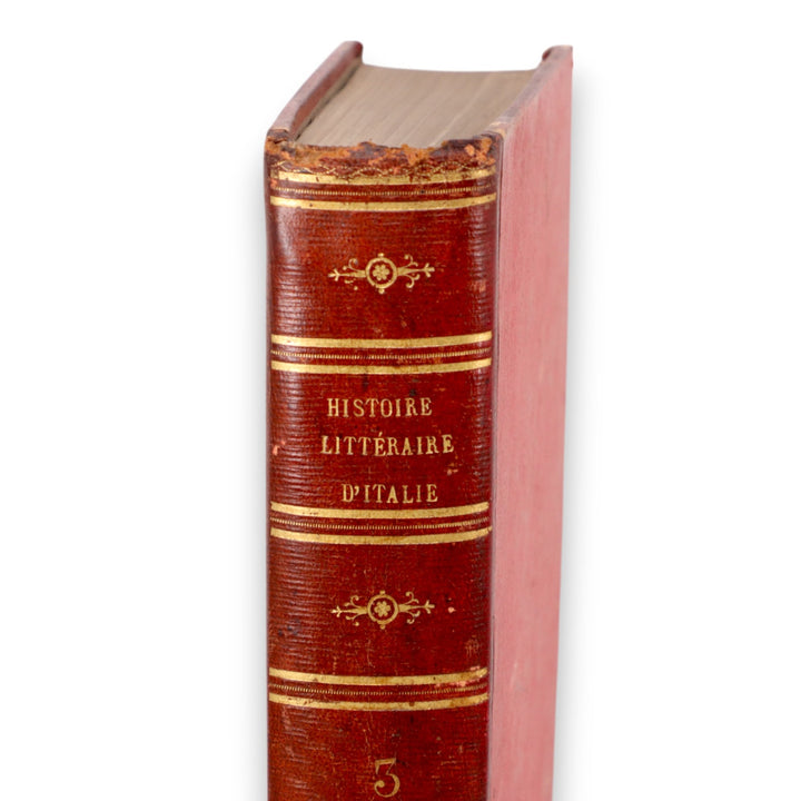This is a reprint of Volume 5 of Histoire Littéraire d’Italie by P.L. Ginguené, printed in Paris in 1819 by L.G. Michaud, with printing done by L’Imprimerie d’Anth. Boucher. Bound in striking red leather with gilt detailing on the spine, this early 19th-century French book reflects Enlightenment-era scholarship on Italian literary history.