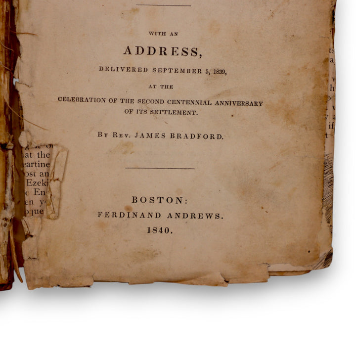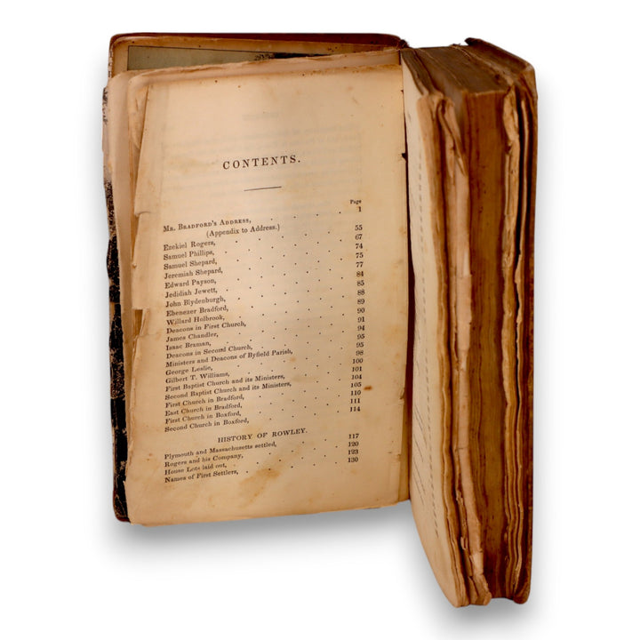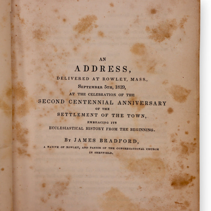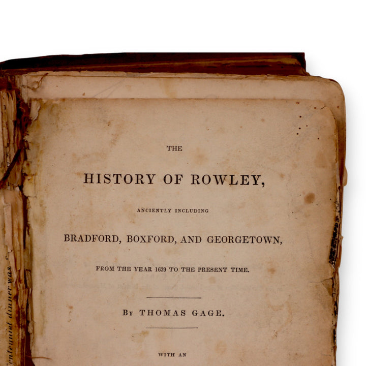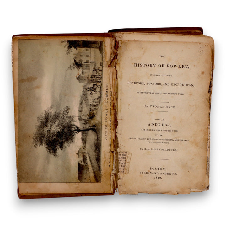 A rare original historical volume titled "The History of Rowley, Ancently Including Bradford, Boxford, and Georgetown, From the Year 1639 to the Present Time", by Thomas Gage. Printed in Boston by Ferdinand Andrews in 1840. Includes Rev. James Bradford’s address commemorating the 200th anniversary of the town's settlement.