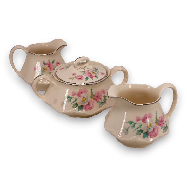 Homer Laughlin R3543 3pc Creamer Sugar Bowl Set Roses Platinum Trim USA Vintage 1930's