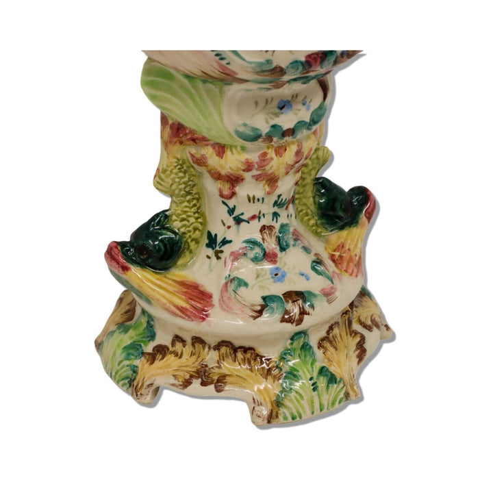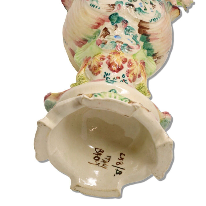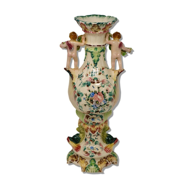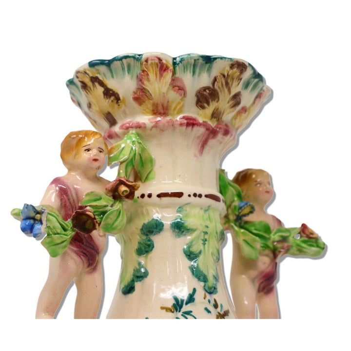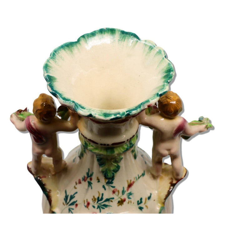 Italian Majolica Hand Painted Porcelain Amphora Vase Putti Handles 14" Late 19th C.