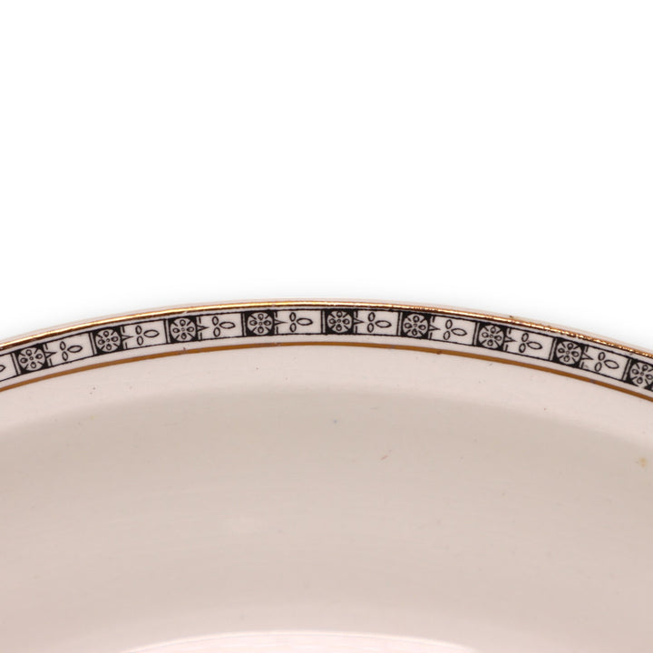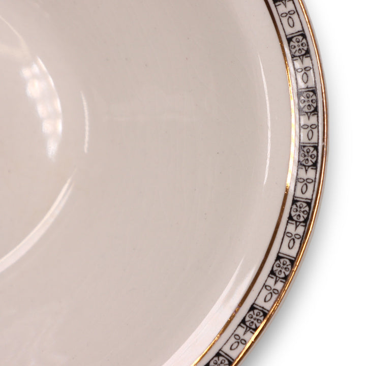 Cream white plate with black patterned border with gold banding.