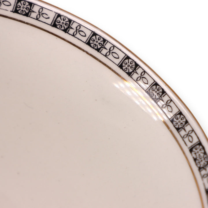 Cream white plate with black patterned border with gold banding.