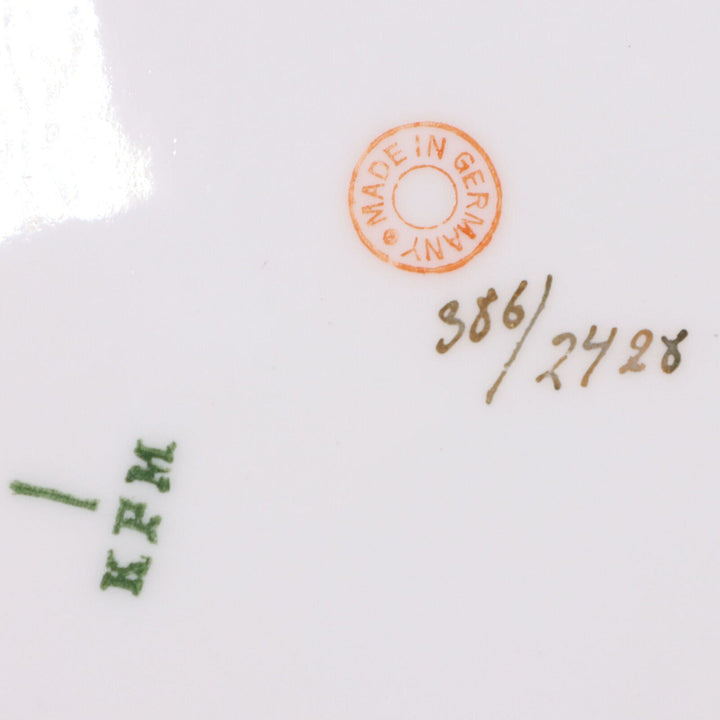 Krister Porzellan-Manufaktur was established in 1831 by Carl Franz Krister. He worked before for two other factories active in a city of Waldenburg, formerly German, but now Poland. Marked "Made in Germany" in red and numbered 386/2428 in gold.
