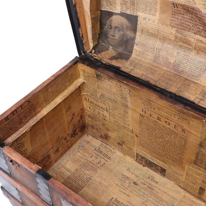Leather Panel Dome Top Antique Steamer Trunk 34 1/2" 18th C. Newsprint Lined