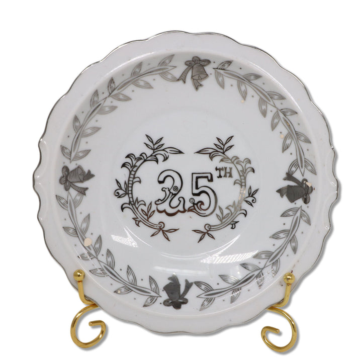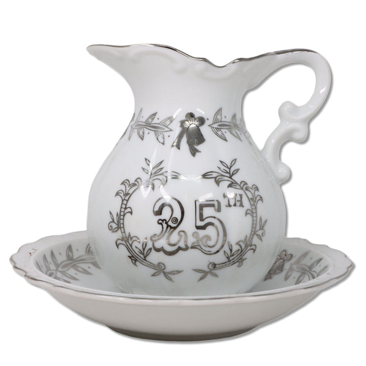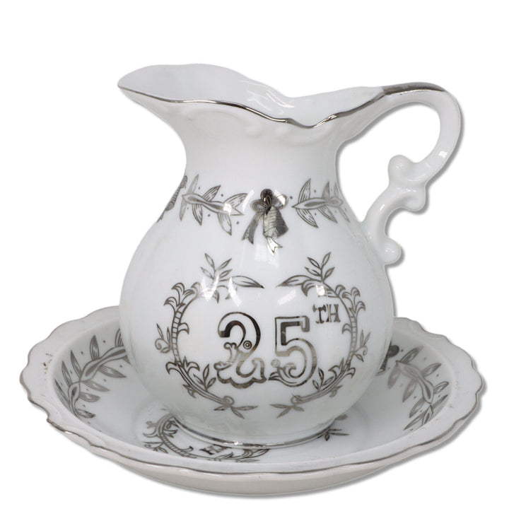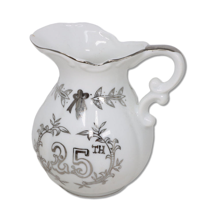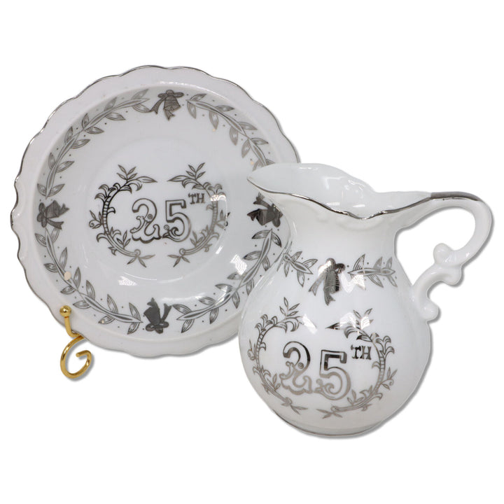 Lefton 25th Anniversary Pitcher and Liner Bowl Silver on White Porcelain