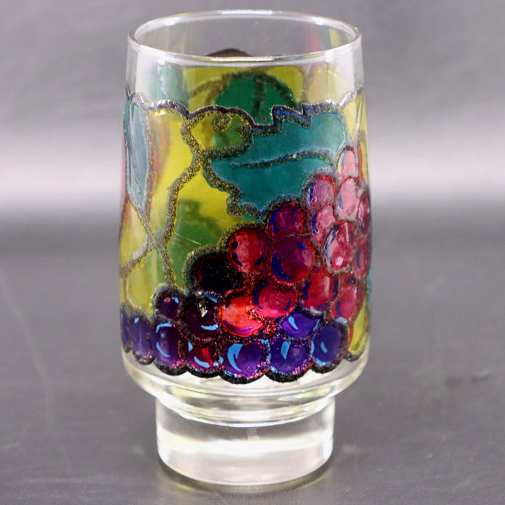 This charming hand-painted glass tumbler features a bright and cheerful stained-glass-style fruit motif, including apples, grapes, and leaves in vivid jewel tones. With its raised black outlines and translucent colors, this piece brings a touch of retro artistry to any table or kitchen display. Perfect for collectors of mid-century or 1980s glassware, this cup showcases craftsmanship and color rarely seen in modern drinkware.