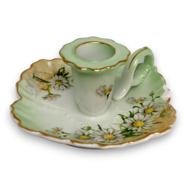 This exquisite Limoges China chamberstick candle holder features a hand-painted daisy motif accented with soft mint green and delicate gold trim. The scalloped edges and graceful handle showcase the refined craftsmanship for which Limoges is renowned. Produced in the late 19th century, this charming piece embodies the grace and detail of Victorian porcelain artistry — perfect for collectors or elegant home décor.