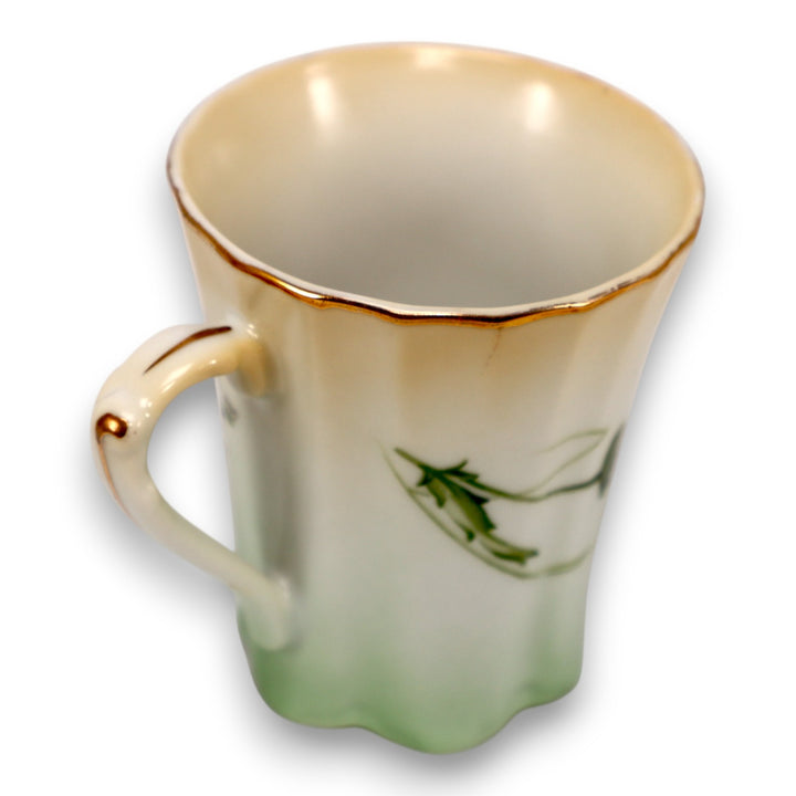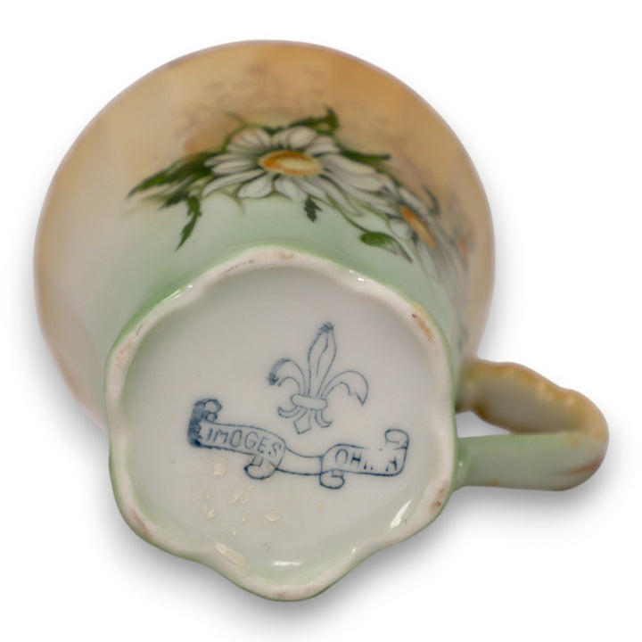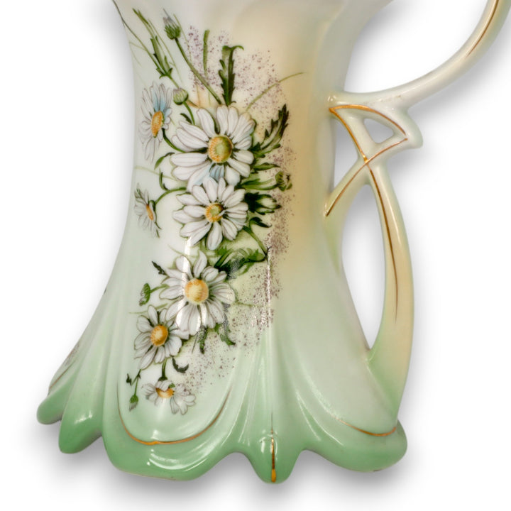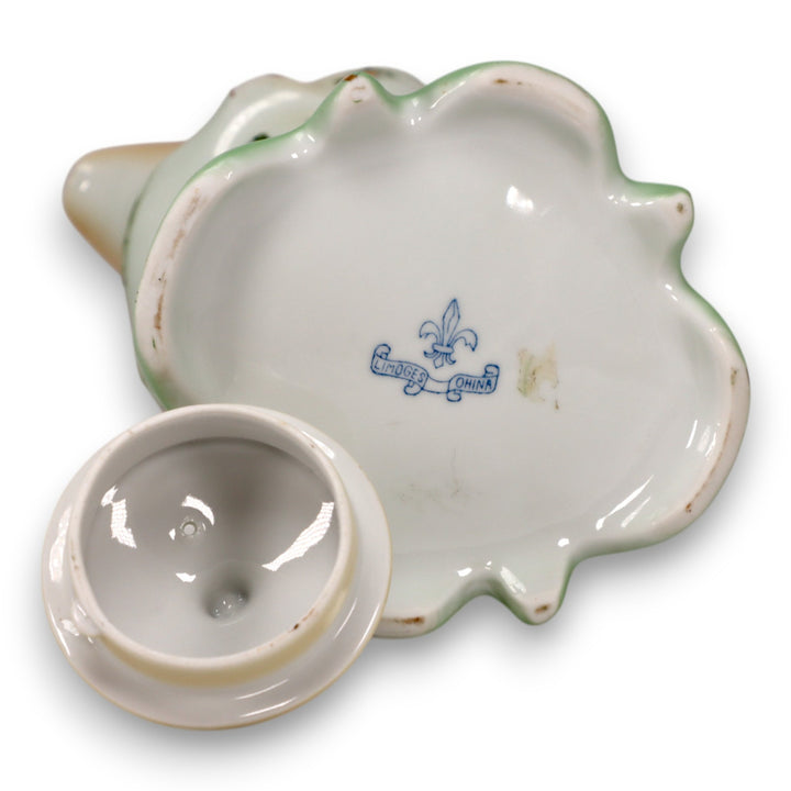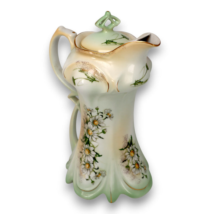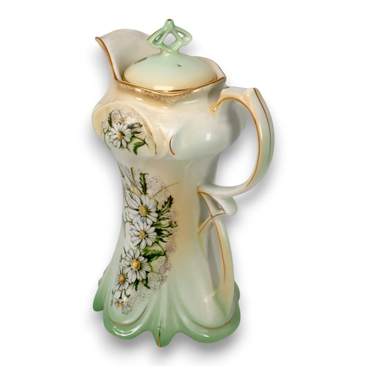 This stunning Limoges China chocolate pot and cup set features a soft gradient green and ivory finish with hand-painted daisies and delicate gold accents. The set’s intricate Art Nouveau design showcases elegant curves and fine craftsmanship, typical of early 20th-century French porcelain. Perfect for collectors or as a striking vintage display piece, this set embodies Limoges’ legacy of refined artistry and timeless beauty.