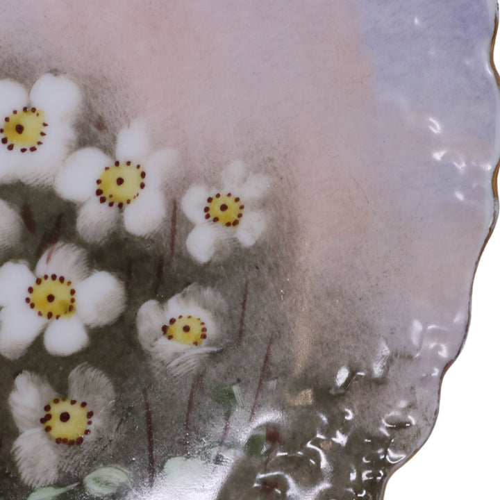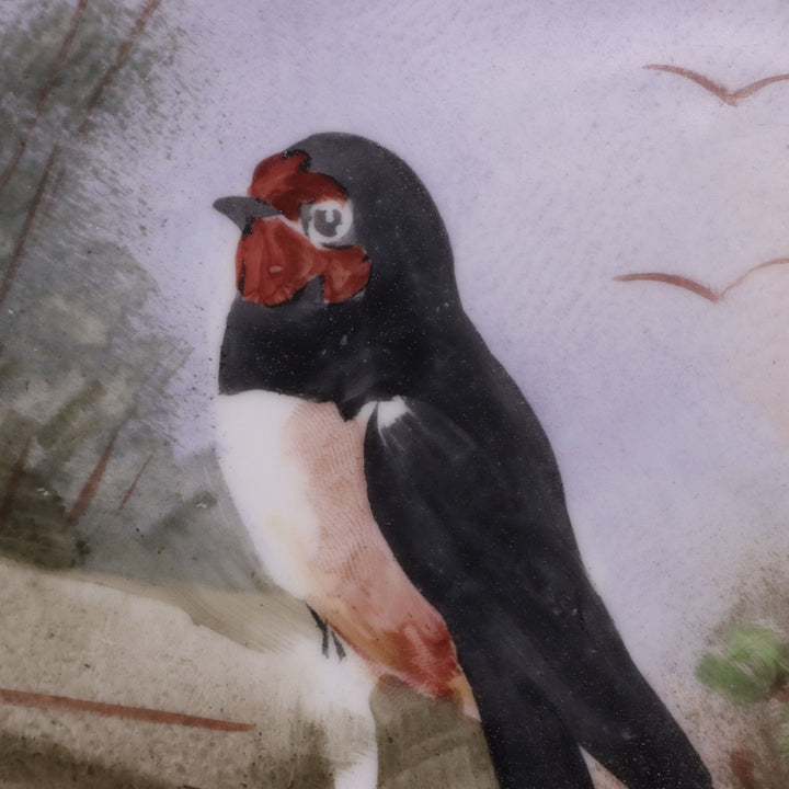 Embossed band, scalloped edges with gold rim. Painting of ?Robin on roof by nest with daisies on the background.