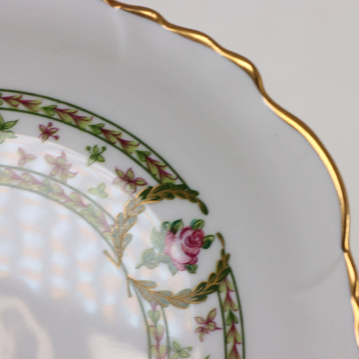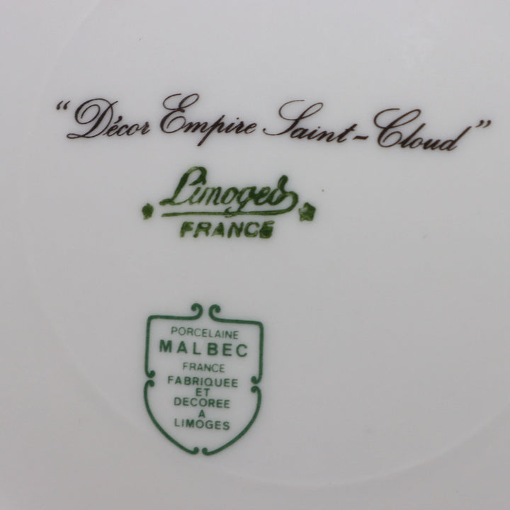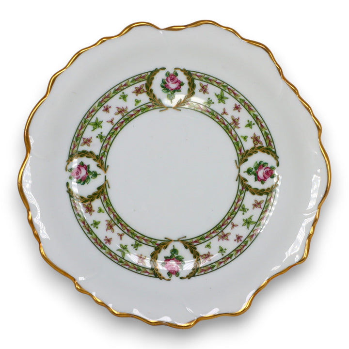 Beautiful vintage porcelain plate by Malbec Limoges, France, in the "Décor Empire Saint-Cloud" pattern. Features a delicate pink rose and vine motif with intricate gold laurel wreath medallions and scalloped gold trim.