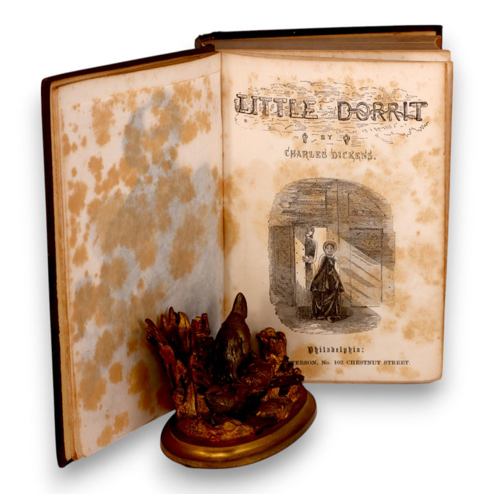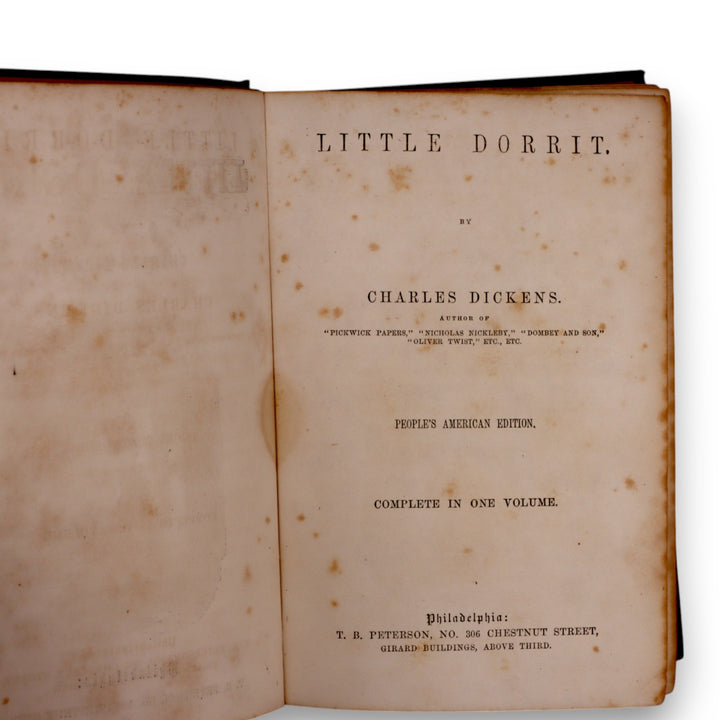 Offered is an antique People’s Edition of Little Dorrit by Charles Dickens, published by T. B. Peterson, 102 Chestnut Street, Philadelphia. This Duodecimo Edition is part of Peterson’s complete works of Dickens. Bound in embossed brown cloth with gilt spine illustration, this single-volume edition offers collectible and literary value for Dickens enthusiasts.