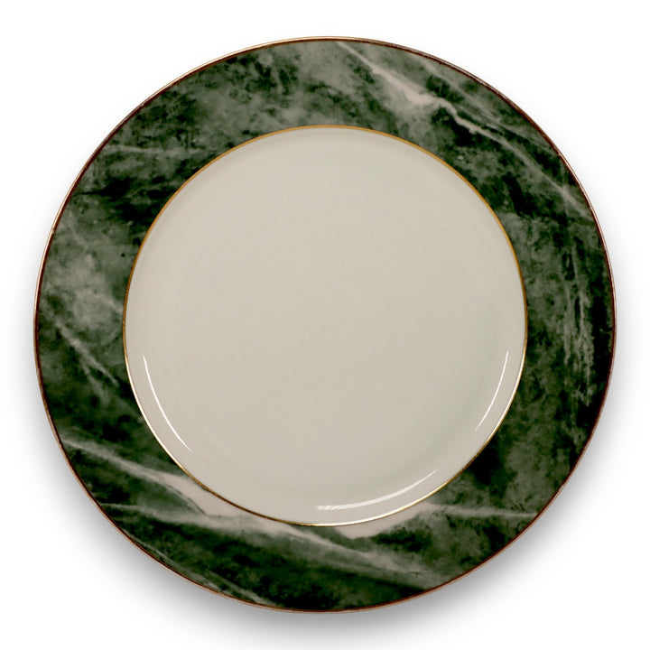This elegant Mikasa dinner plate in the Travertine Green pattern was designed by Bardi and crafted in Japan. It features a striking marbleized deep green rim bordered by gold trim, contrasting beautifully with the bright white center. Produced as part of the L2112 line during the 1980s, this piece represents Mikasa’s refined modern styling with a luxe touch. Whether completing a set or starting a new one, this plate is a collector’s favorite for both everyday elegance and display-worthy beauty.