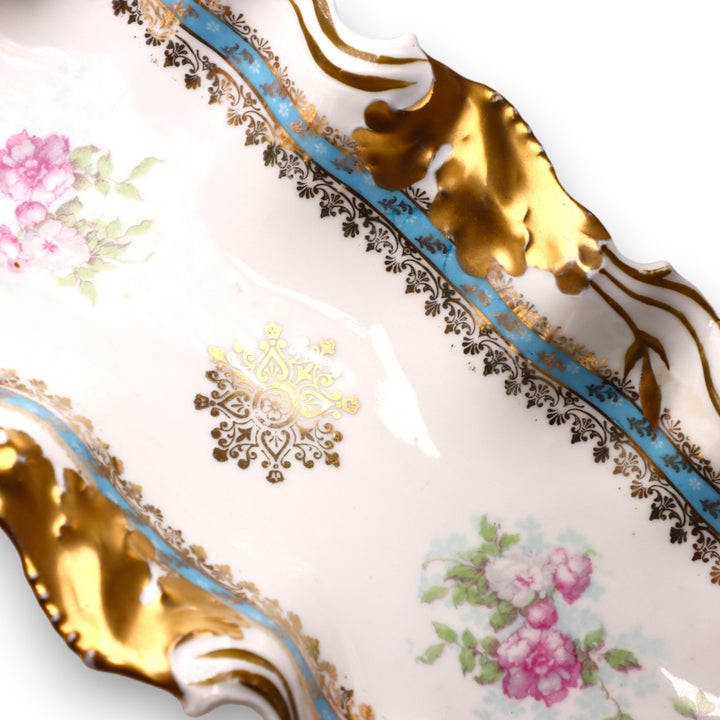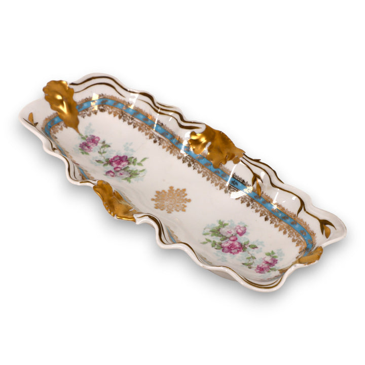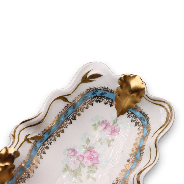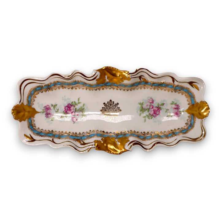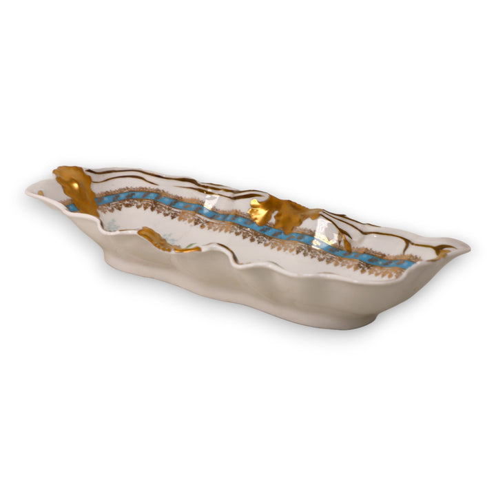 Milton Austria Rectangular Asparagus Dish Blue Gold Lace Floral Antique C 1900