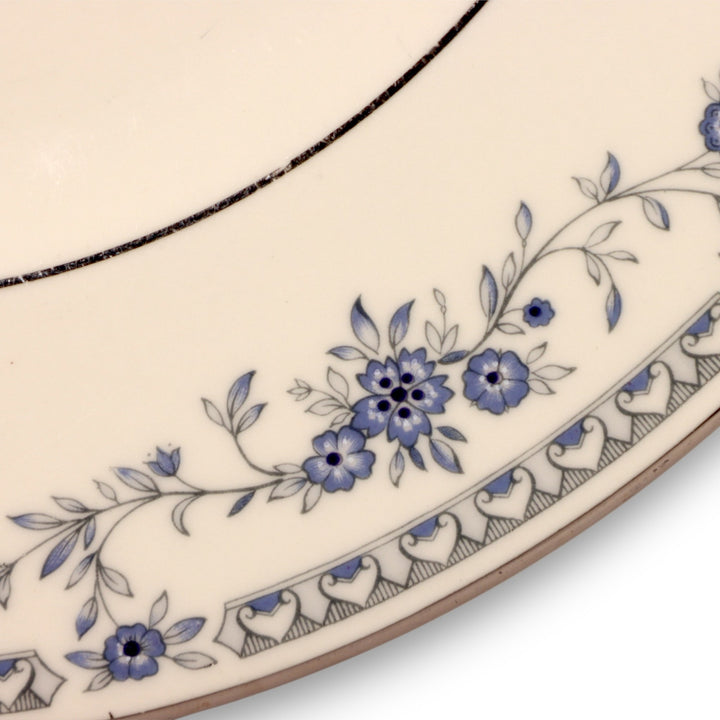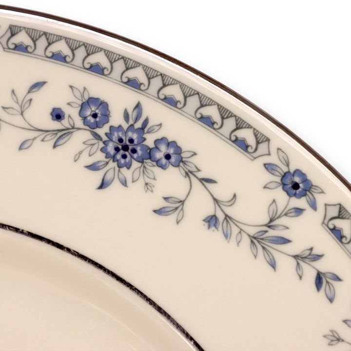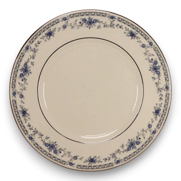 This exquisite Minton "Bellemeade" dinner plate captures the timeless elegance of English bone china. Crafted in England by Minton Limited, the plate features a delicate garland of blue floral sprays, intertwined with silver-toned lattice borders and fine platinum trim. With its refined design and high-quality craftsmanship, this plate is a beautiful addition to any formal table or collector's china cabinet.