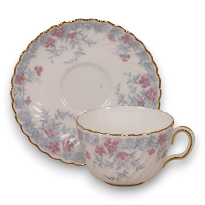 Minton Garden Pinks S575 Tea Cup Saucer Set Swirl Fluted Floral Vintage England 1940's