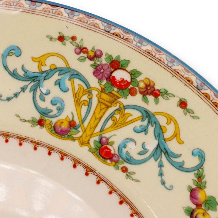 This beautiful Myott Royal York dinner platefeatures the vibrant Fruit & Scroll design, a striking example of English Art Deco tableware from the 1930s. The piece showcases a lively arrangement of hand-colored fruits surrounded by ornate turquoise scrollwork, golden urn motifs, and a cobalt-blue edge. A fine representation of early 20th-century Staffordshire craftsmanship, this bowl adds elegance and color to any vintage china collection or tablescape.