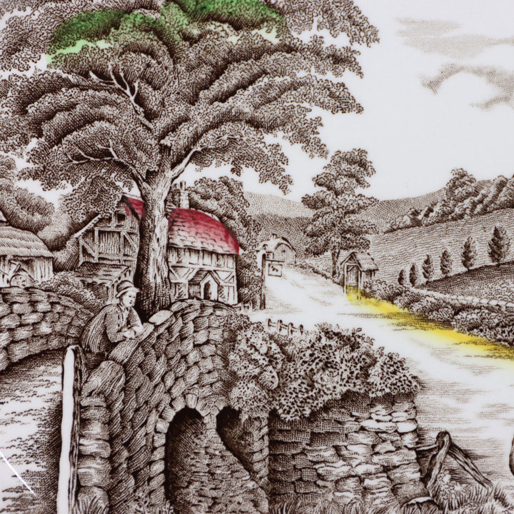 Charming transferware luncheon plate made by Myott, Son, and Co. of Staffordshire England, likely between the 1940s and 1950s based on the backstamp. The plate features a pastoral rural scene with a beautiful stone bridge as the focal point.