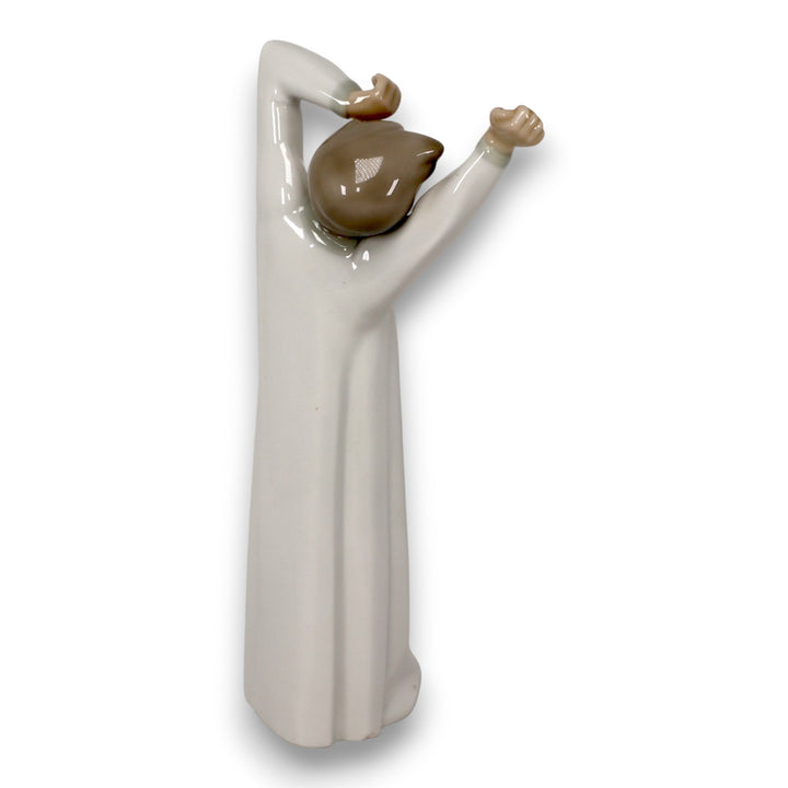 This charming Nao by Lladro porcelain figurine depicts a sleepy young boy in a nightshirt mid-yawn and stretch — a beautiful example of Lladro’s expressive artistry. Finished in glossy porcelain, the piece captures gentle realism with subtle color and fine sculptural detail. Handmade and hand-painted in Spain, this collectible figurine adds a touch of warmth and nostalgia to any curio cabinet or porcelain collection.
