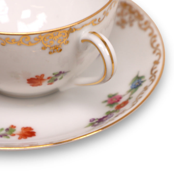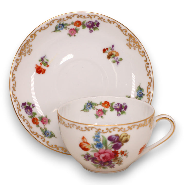 Noritake Dresdoll Floral Gold Rim Flat Tea Cup Saucer Set Japan Vintage 1950's